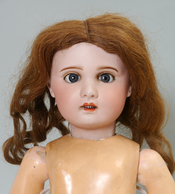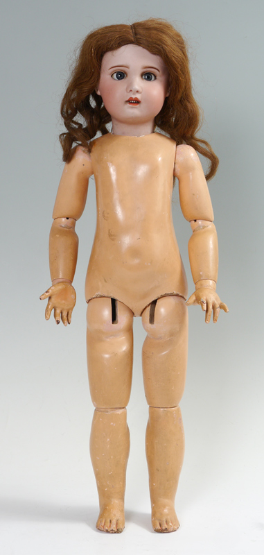ANTIQUE FRENCH BISQUE HEAD TODDLER DOLL 13, S.F.B.J.: (Societe Francaise de Fabrication de Babes et Jouets). Beautiful complexion bisque socket head marked S.F.B.J. Paris 13. Sleepy blue eyes, open mouth showing teeth. Jointed composition body. 29'' tall.