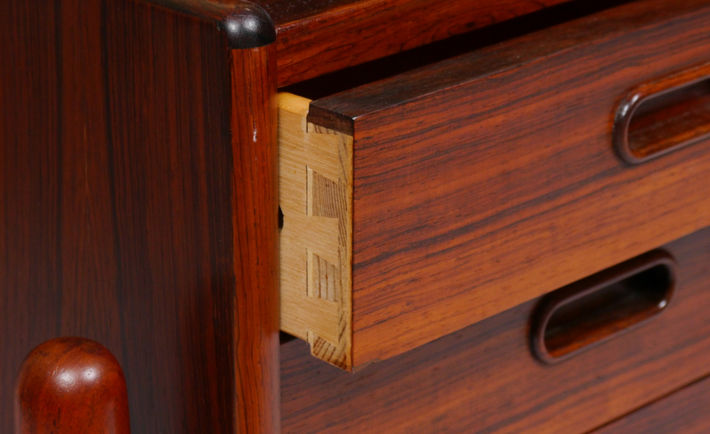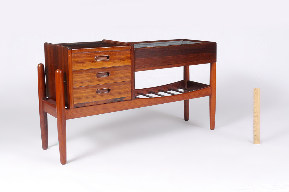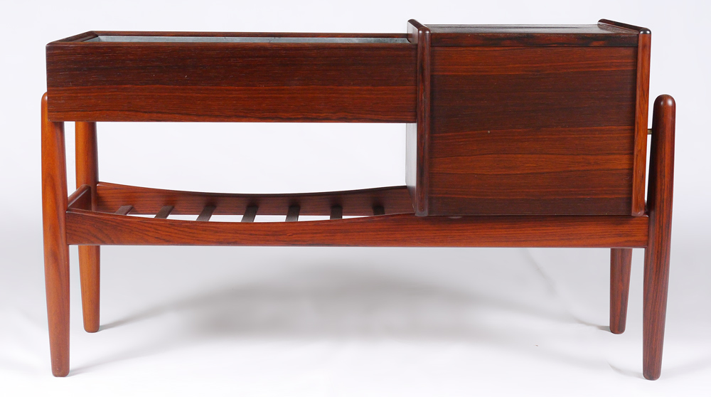 DANISH MODERN ROSEWOOD ENTRY PIECE: Designed by Arne Wahl Iverson. Planter table with liner, over slatted lower level, 3 drawers at the side. Measures 22'' x 38'' x 13''.