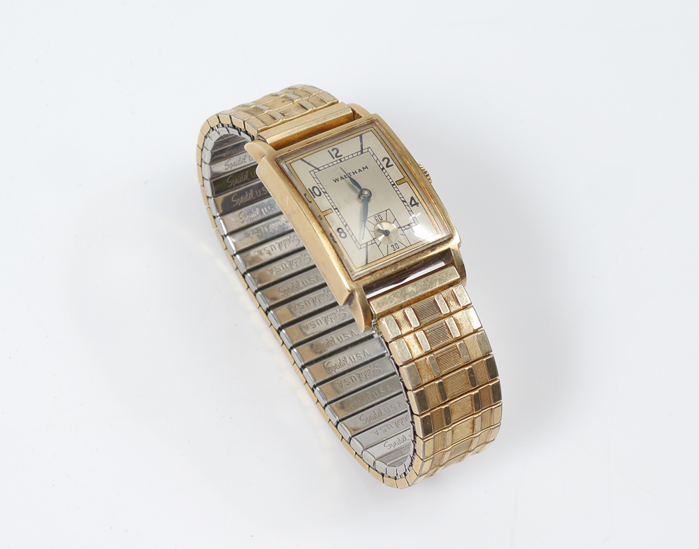 WALTHAM 14K WATCH: Tank type rectangular watch, the dial with numeral and bar markers, secondary dial. In working order. The band is a gold tone Speidel stretch.