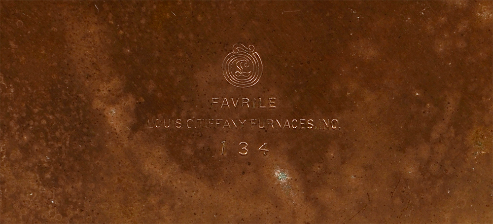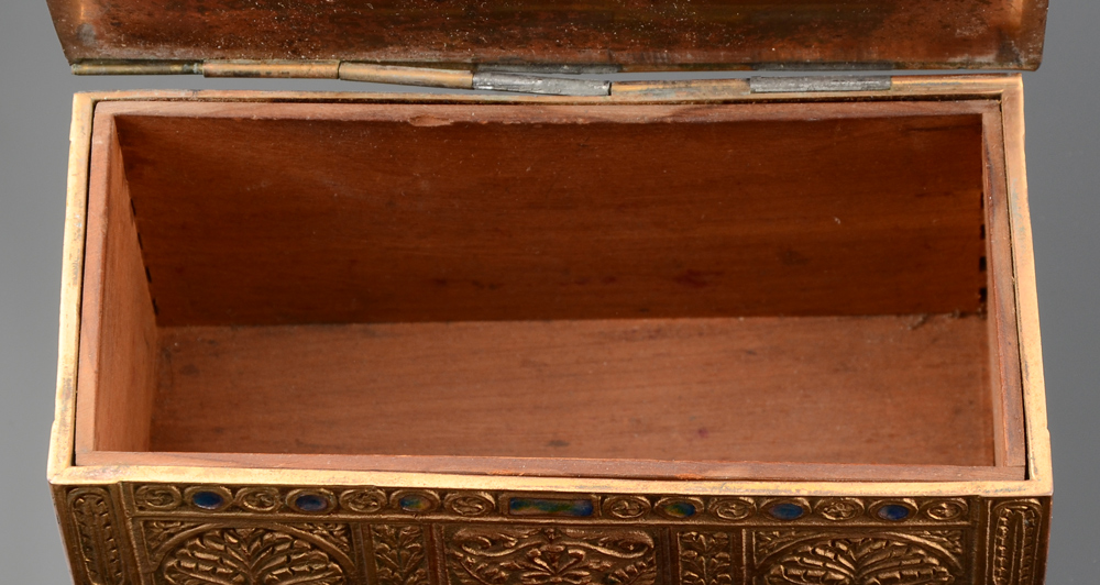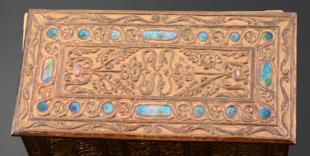 TIFFANY FURNACES FAVRILE BRONZE BOX: Embossed foliate designs with inset cabochons of favrile glass. Hinged lid, marked on base ''Favrile, Louis C. Tiffany Furnaces, Inc. 134''. Measures 3 1/2'' h. x 7'' x 3 5/8''.