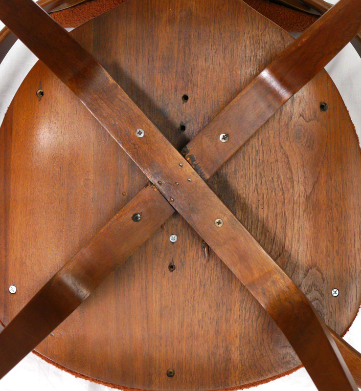 4 NORMAN CHERNER FOR PLYCRAFT DINING CHAIRS: Laminated walnut chairs, 2 arm and 2 side, designed by Norman Cherner for Plycraft with Knoll Boucle upholstery. Arm chairs measure 31 3/4'' h. x 27 1/2'' x 21 1/2''.
