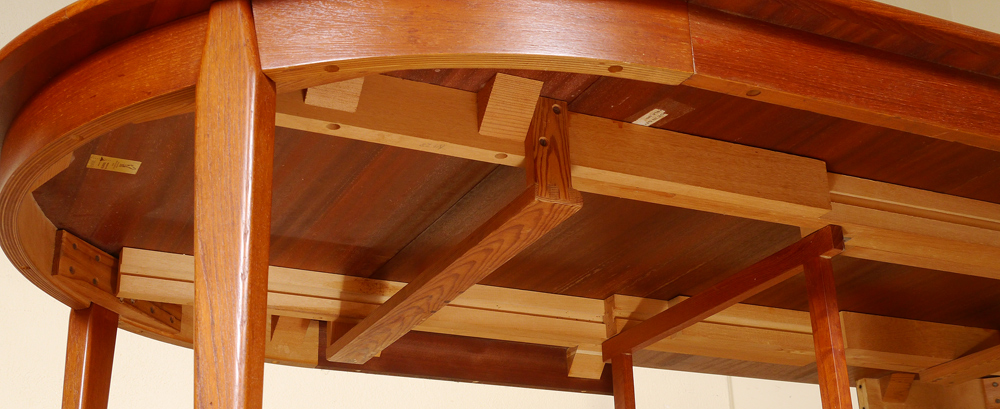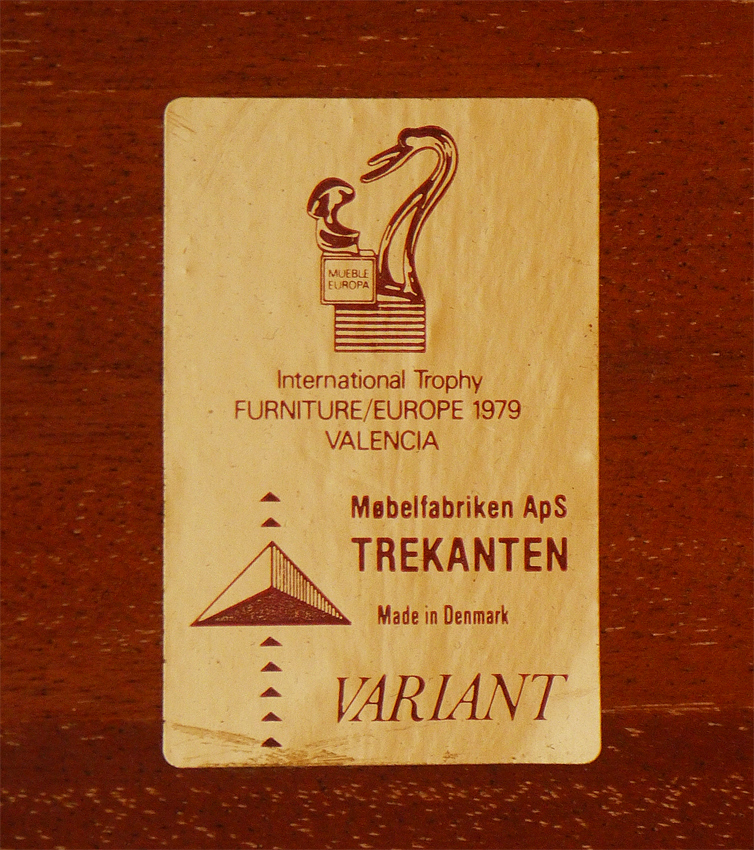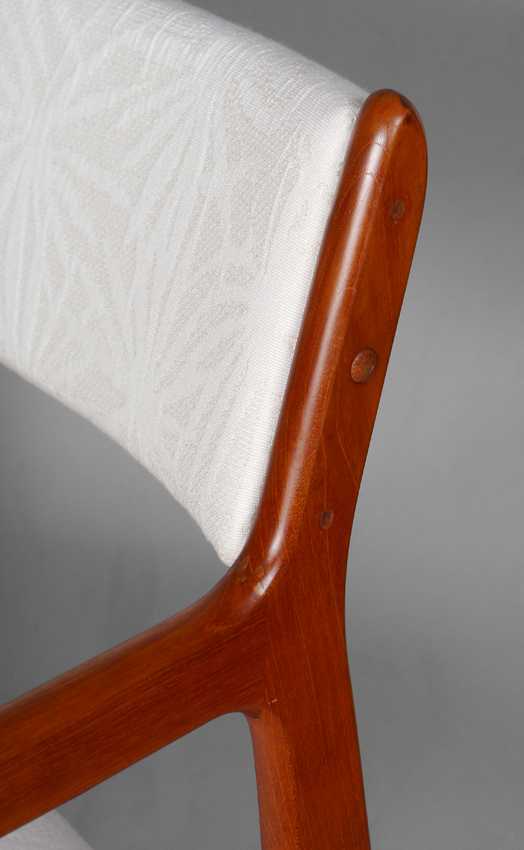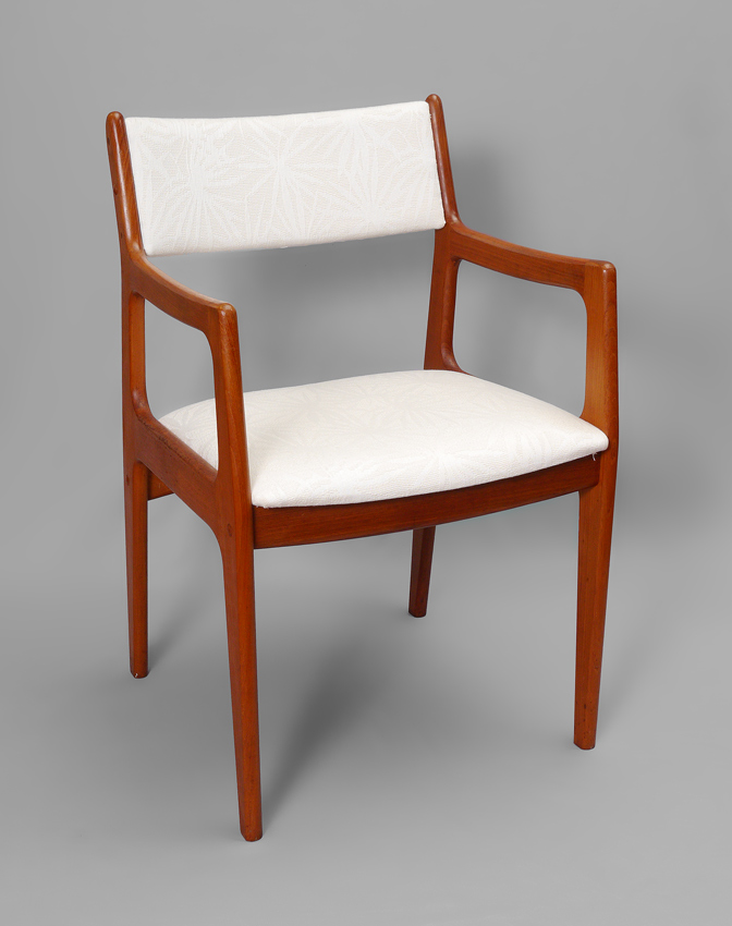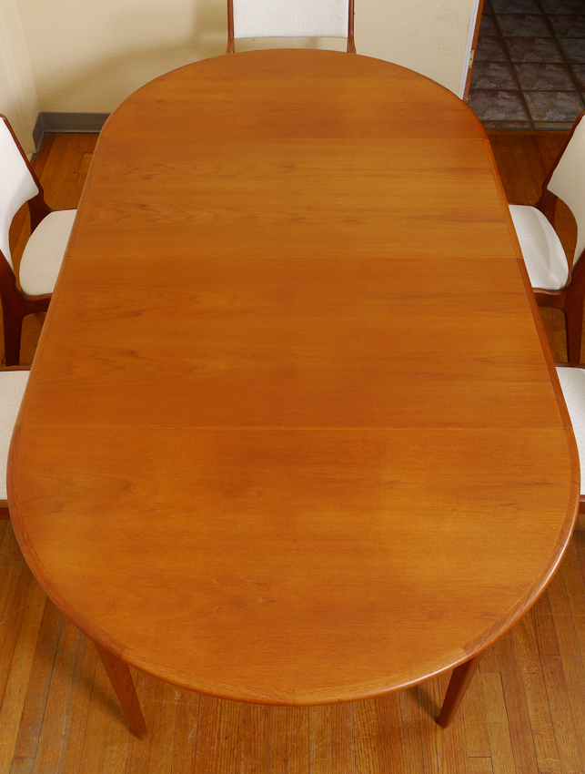 TREKANTEN DANISH MODERN DINING TABLE AND CHAIRS: Dining table with 2 leaves, and 6 chairs. The 2 arm and 4 side chairs are newly upholstered.
