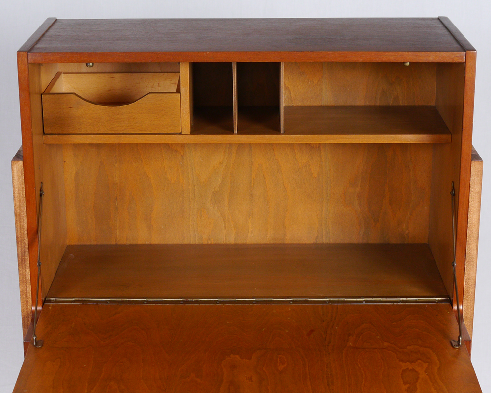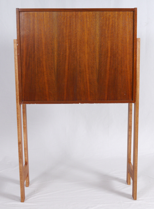 MID CENTURY MODERN TEAK SECRETARY: Drop front secretary, interior with single drawer, pigeon holes and open storage, over 2 drawers. No visible marks, measures 46'' h. x 28 1/2'' x 16 1/4''.