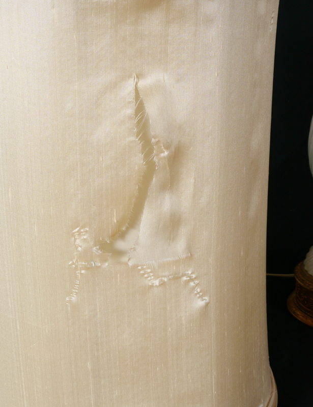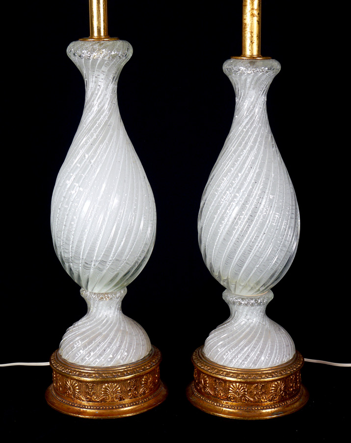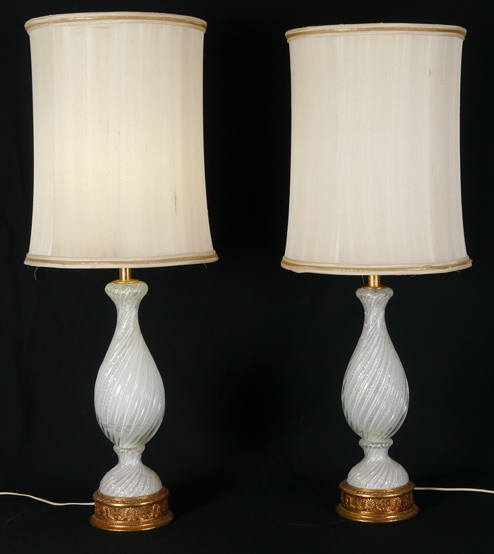 PAIR 1950'S MURANO GLASS LAMPS: White ribbed glass bodies with twist, silver flakes interior, mounted to embossed gilt metal base. Overall 38 1/2'' h. x 6 3/4'', sold with cloth shades, 19'' h. x 14 1/2''.