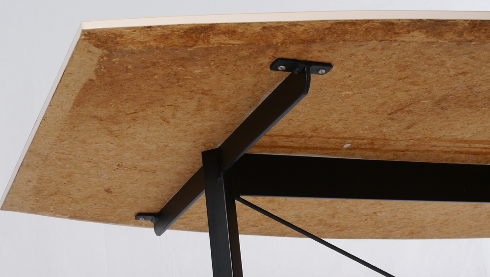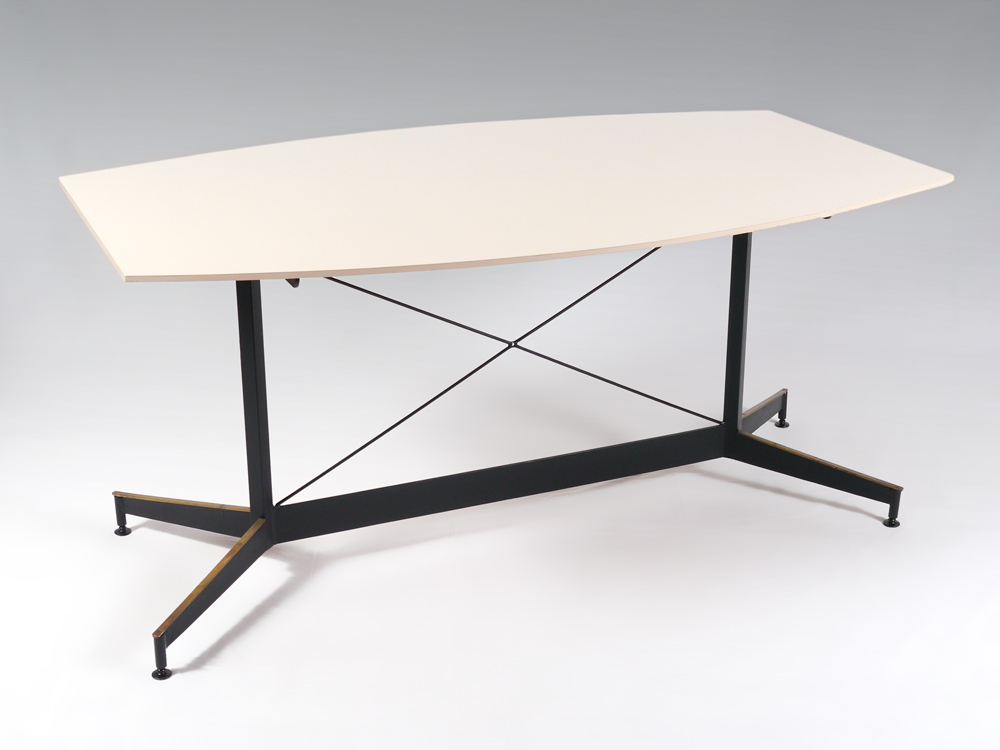 MID CENTURY MODERN TABLE/DESK: Cream laminate top over a black metal base with X configuration and brass accents, overall measures 28 1/2'' h. x 60 1/4'' x 36''.