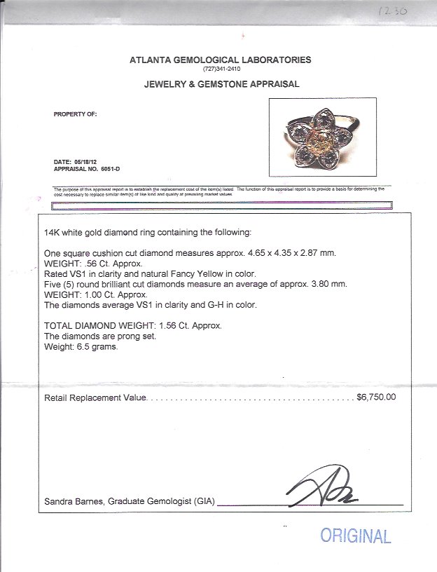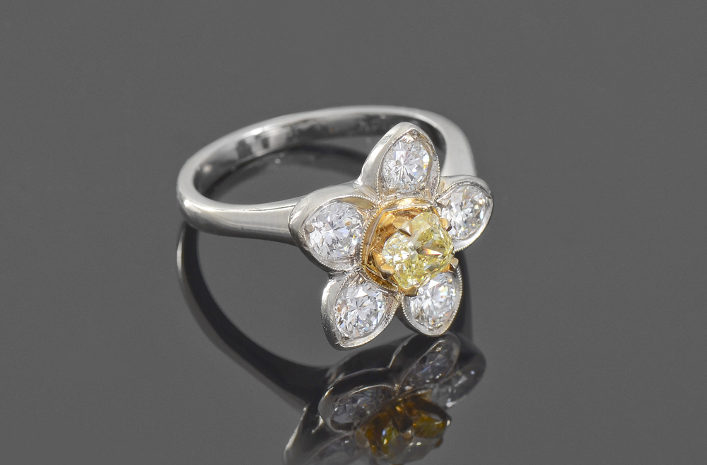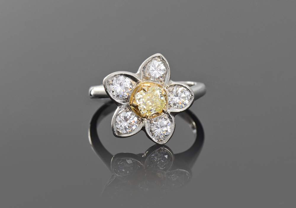 RETRO DIAMOND DAISY RING: At the center is an approx. .56 Ct square cushion cut fancy yellow diamonds surrounded by 5 round brilliant ''petal'' diamonds totaling approx. 1.00 Ct., G-H color. All stones are rated VS1 clarity. Size 7. Weight 6.5 grams. Sold with 2012 Atlanta Gemological GIA graduate's appraisal for $6750.