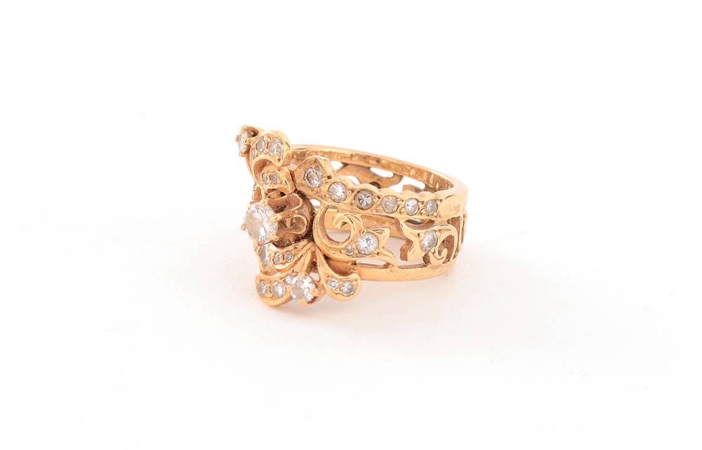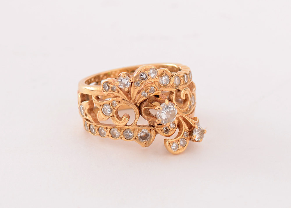 UNUSUAL GOLD FILIGREE DIAMOND RING: 14K yellow gold scrolling filigree ring with 34 round full cut and single cut diamonds totaling approx. .90 Ct., rated VS-SI in clarity and H-I in color. The diamonds are prong set. Weight: 5.6 grams. Size: 5