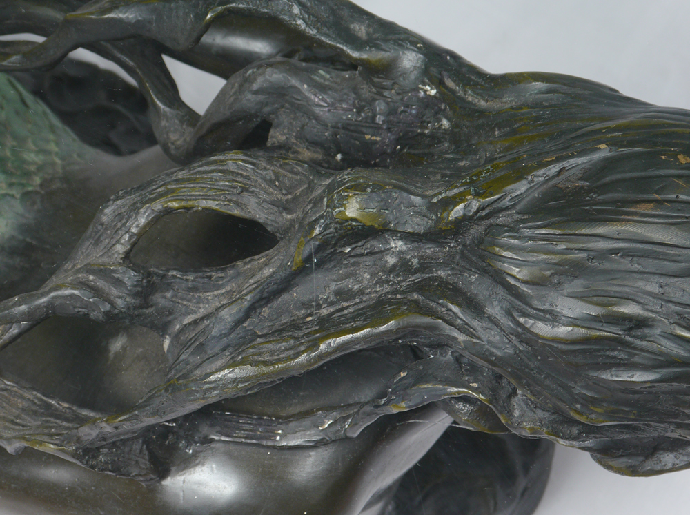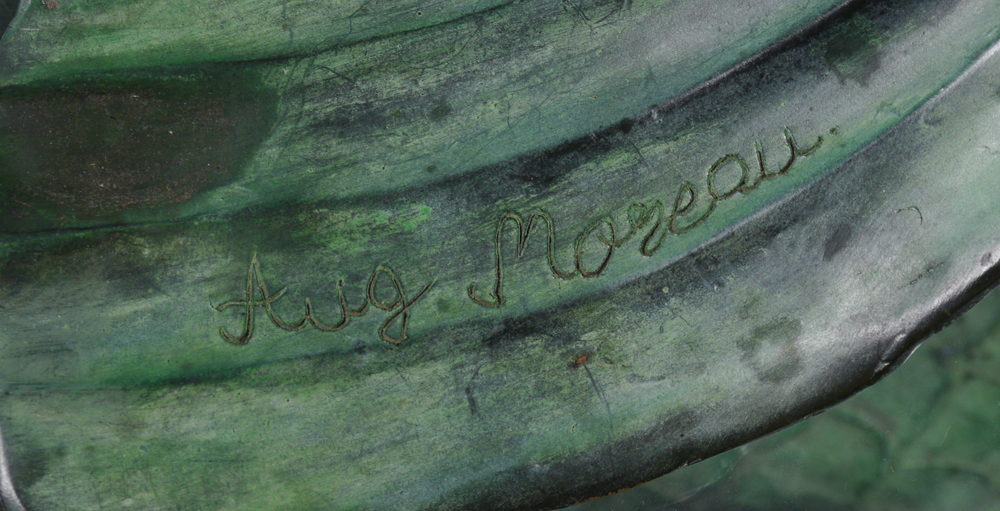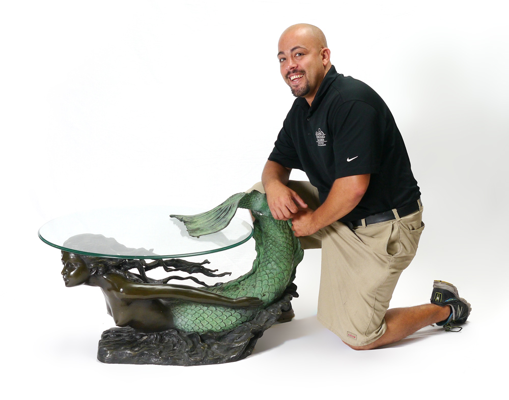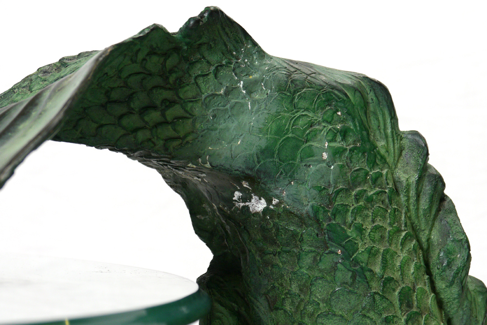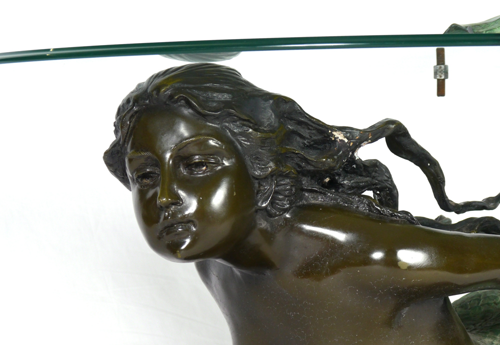 PATINATED BRONZE FIGURAL MERMAID COFFEE TABLE: Figure of semi nude mermaid with tail up, spurious Aug. Moreau signature on tail. Glass top, mounts under tail. Overall measures 22 1/2'' h. x 39 1/4'' x 30''.