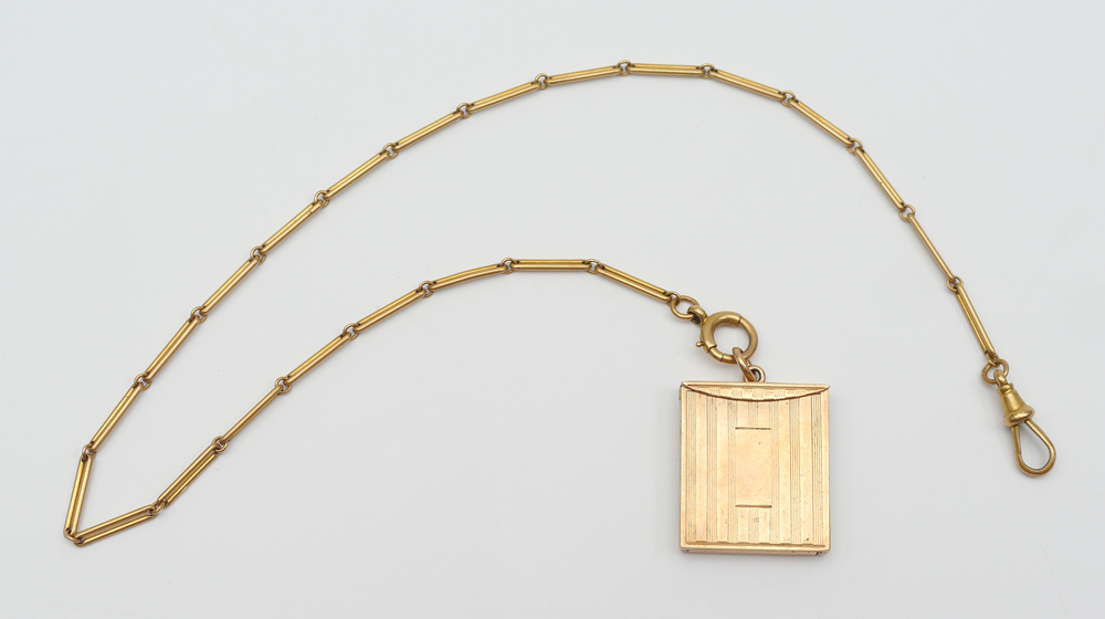 CARTIER 14K PICTURE LOCKET FOB ON 18K WATCH CHAIN: Signed Cartier 14k yellow gold tri fold picture locket fob, 1'' square, suspended from an 18K yellow gold watch chain, 13'' length, hallmarked JG&S. Total weight: 31 grams.