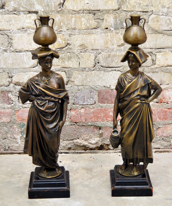 PAIR AUSTRIAN FIGURAL BRONZE GARNITURE MAIDENS: Figures of 2 neo-classical maidens, each with towel and urn atop their head, one holding a staff, the other a water pitcher. Signed C. Lux. Wien. Each affixed to wood base, overall 22 1/4'' h. x 7''.