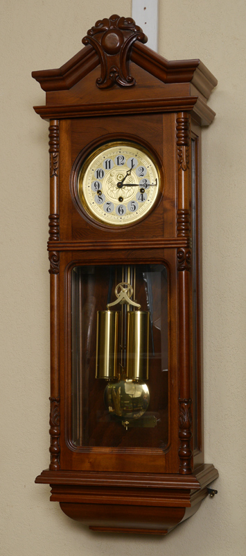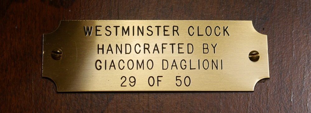 GIACOMO DAGLIONI REGULATOR WALL CLOCK: Contemporary walnut case with carved pediment & 3/4 column decoration. Brass dial with Arabic numerals marked Westminster, Made in Germany. Dual weight with single pulley time and strike movement. Brass plaque inside read ''Westminster Clock, Hand Crafted by Giacomo Daglioni, 29 of 50''. Overall measures 41 1/4'' h. x 13 3/4'' x 7 1/2''.