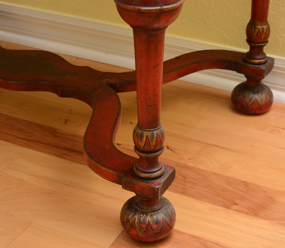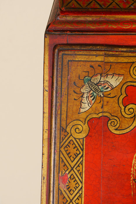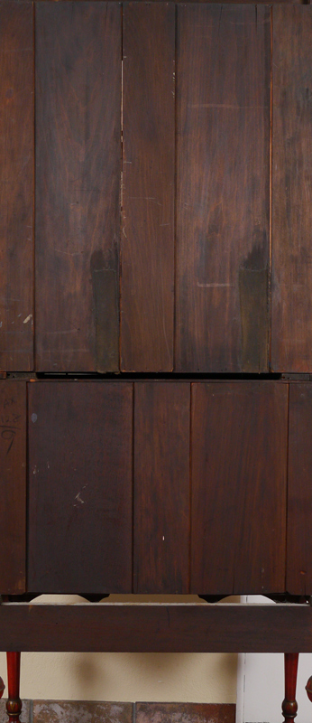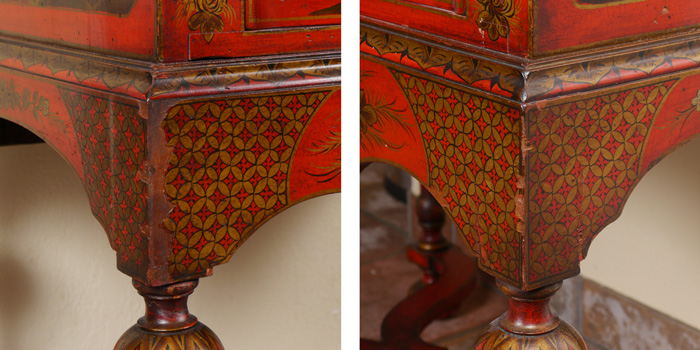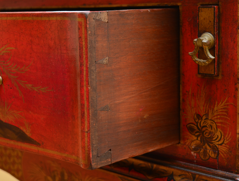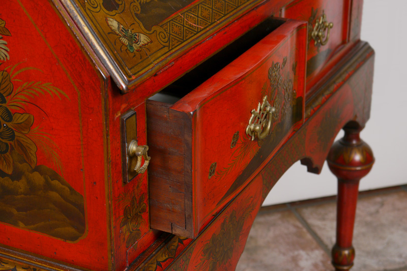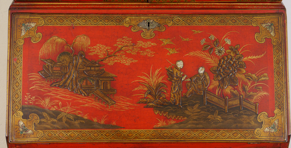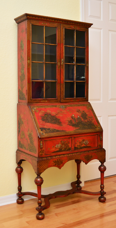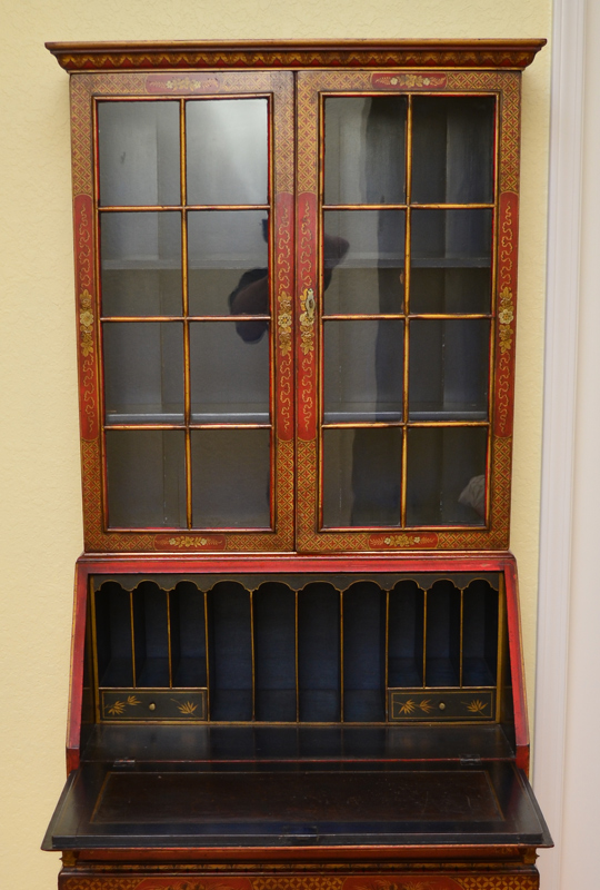 19TH C RED JAPANNED CHINOISERIE DECORATED BOOKCASE SECRETARY: Bicentennial William and Mary Bookcase Secretary Ca late 1800's. Glazed sixteen light bookcase top with gold lattice decor over a slant lid secretary below having a valenced interior, and a red leather inset to drop lid, two dovetailed drawers with shaped fronts and chamfered bottoms. The Chinoiserie decorated cabinet with a classic William and Mary cross stretcher base. 74 1/2''h x 30''w x 20''d. Provenance: ''The Secretary was purchased in 1931 from the Findlay Galleries of Chicago (Now Wally Flndlay/Parke-Bernet) by my father Dr. A.M. Harvey. The Secretary along with many other art objects came from the home of Samuel Insull, a multi-millionaire Utility Executive who became bankrupt after the 1929 Stock Market crash. The Secretary is believed to have been in Mrs. Insull's Bedroom suite.'' John E. Harvey