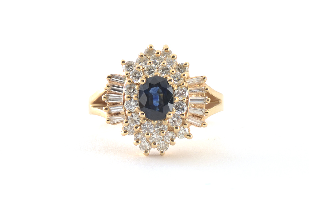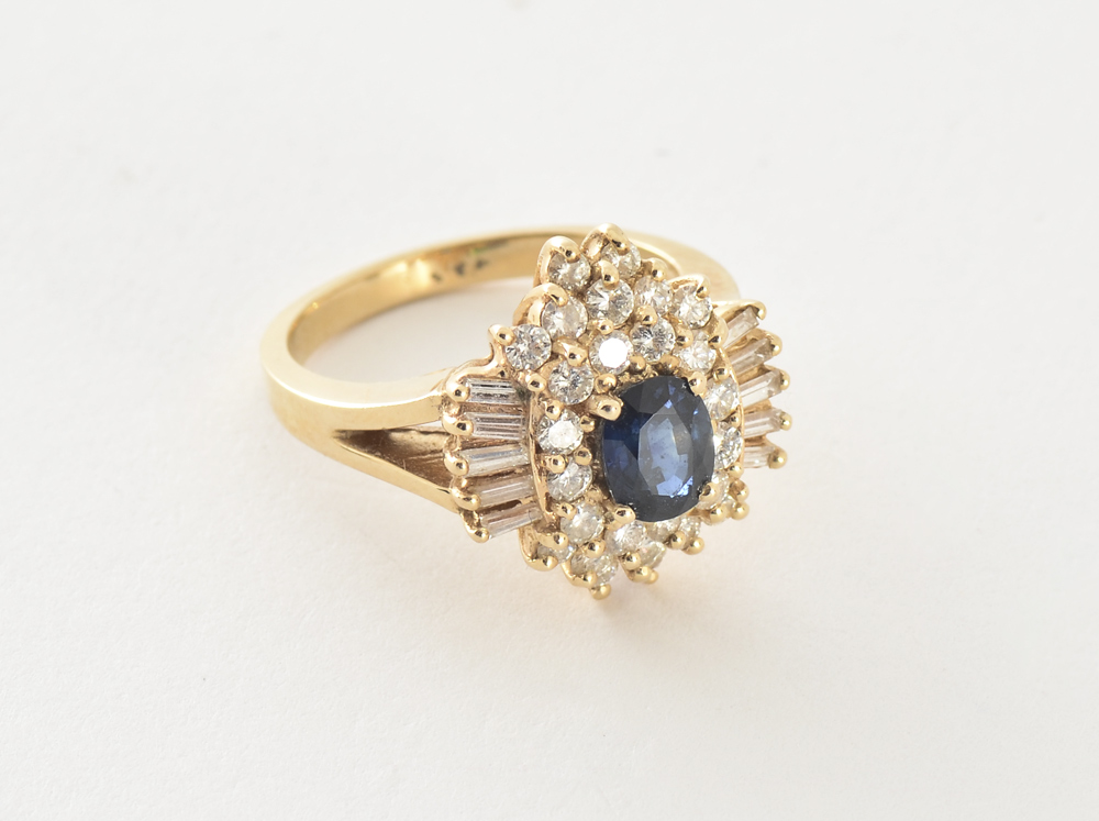 SAPPHIRE & DIAMOND RING: 14K yellow gold ring centers one oval mixed cut sapphire, approx. 1.00 Rated SI in clarity (Type II), B in Hue, 6 in Tone and 3 in Saturation. Enhanced by 26 round brilliant cut diamonds and 10 baguette cut diamonds totaling approx. 1.00 Ct., Rated VS in clarity and H-I in color. Weight: 7.9 grams. Size: 8