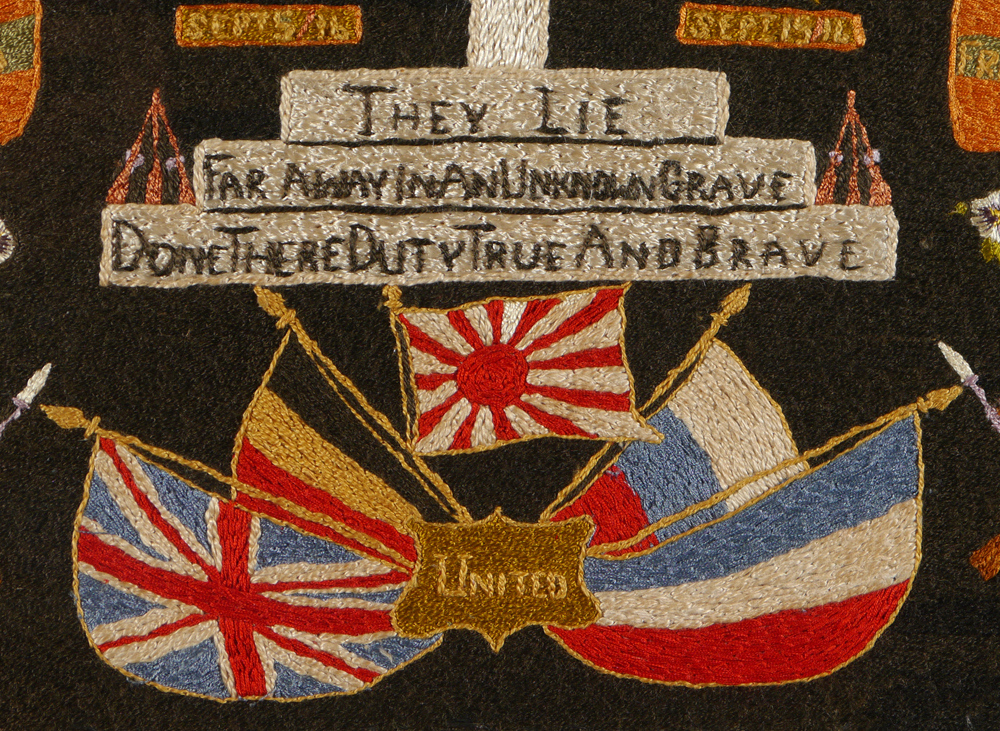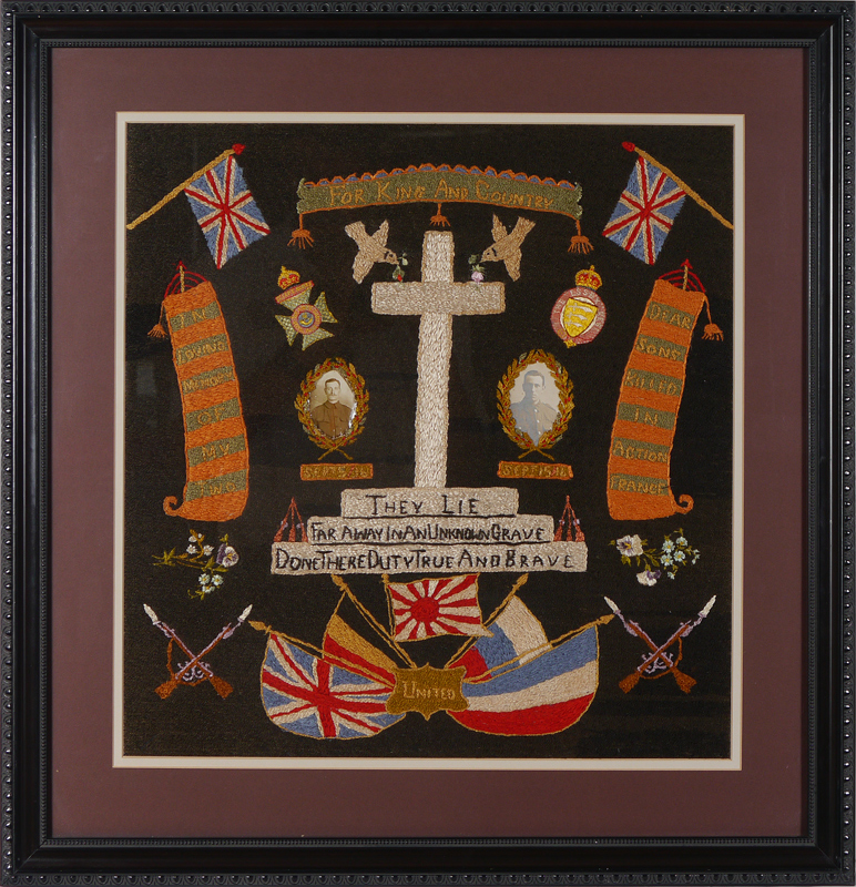 WWI MEMORIAL NEEDLEWORK: Hand worked ''In Loving Memory of My Two Dear Sons Killed In Action France'' ''They Lie Far Away in an Unmarked Grave, Done There Duty True and Brave''. Worked in silk showing the British flags and patriotic symbols around photographs of the brothers. Vivid coloration. Framed and matted under glass, measures approx. 24'' x 24'',