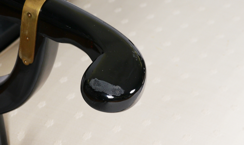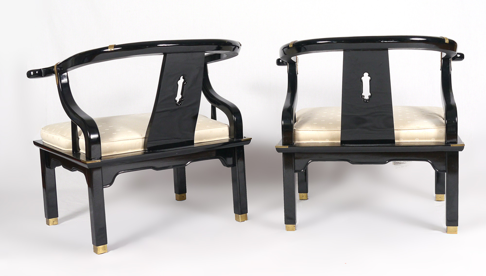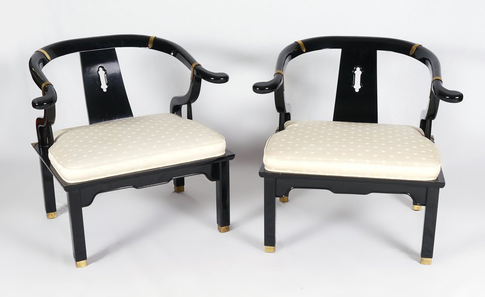 PR CENTURY CHAIR CO BLACK LACQUER CHINESE OX BOW CHAIRS: Classic Chinese style arm chairs, lacquer finish with ivory pattern cushion seats. 29 1/4'' h. x 30 3/4'' x 28 1/2''.