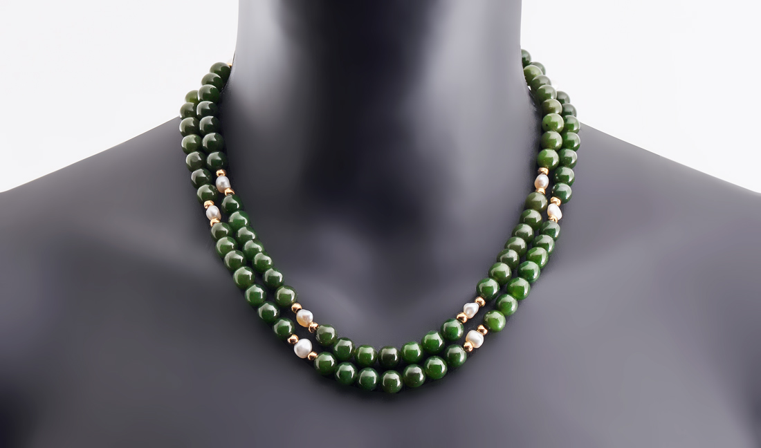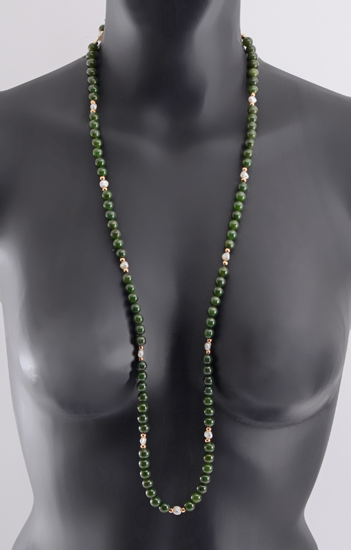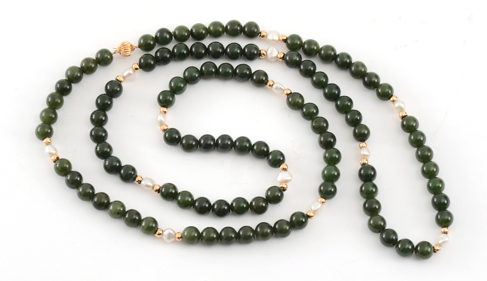 JADE, GOLD & PEARL STRAND NECKLACE: 36'' long strand of 8 mm Nephrite jade beads with fresh water cultured pearls and 14K gold ball spacers and gold clasp.