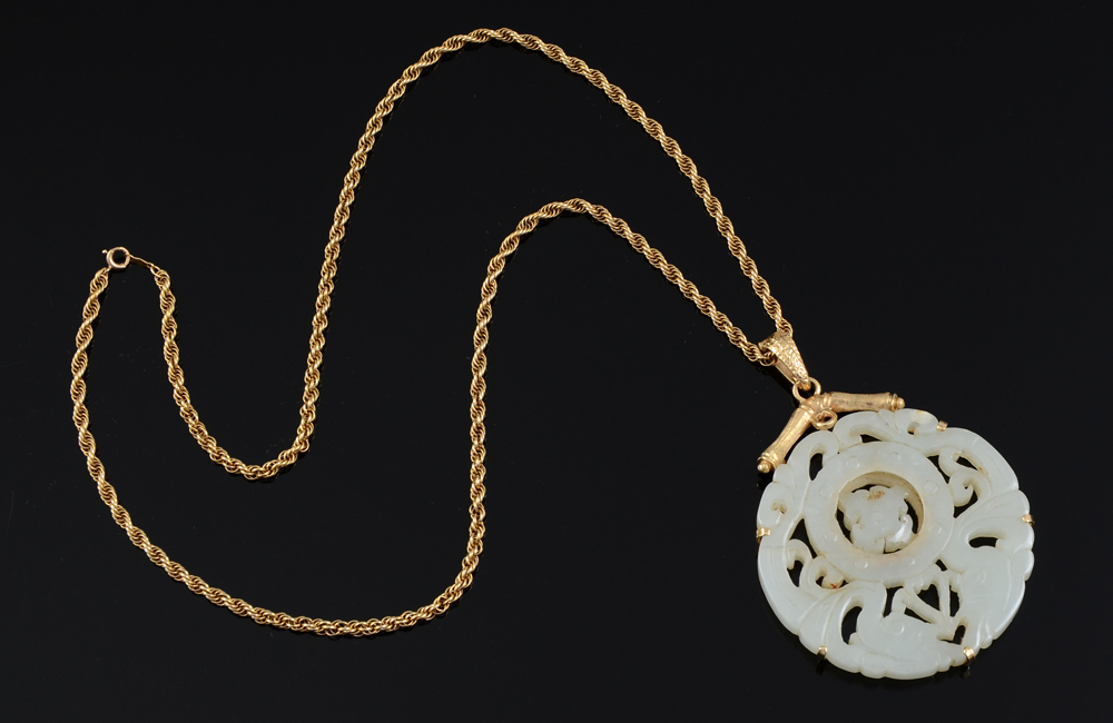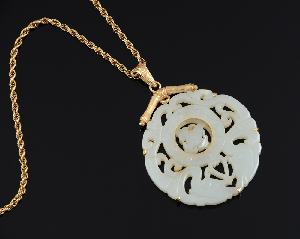 14K NEPHRITE JADE PENDANT & CHAIN: 14K yellow gold mounted pierce carved disc of Nephrite jade, light green in color, 50 mm dia. The 24'' rope chain is also 14K gold. Gold weight approx. 25 grams.