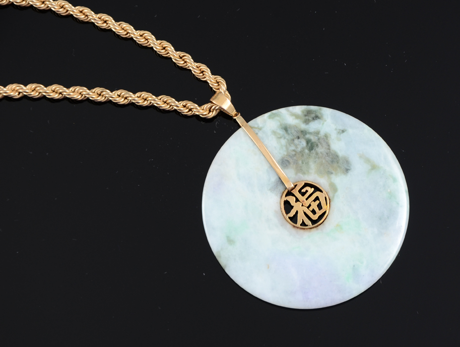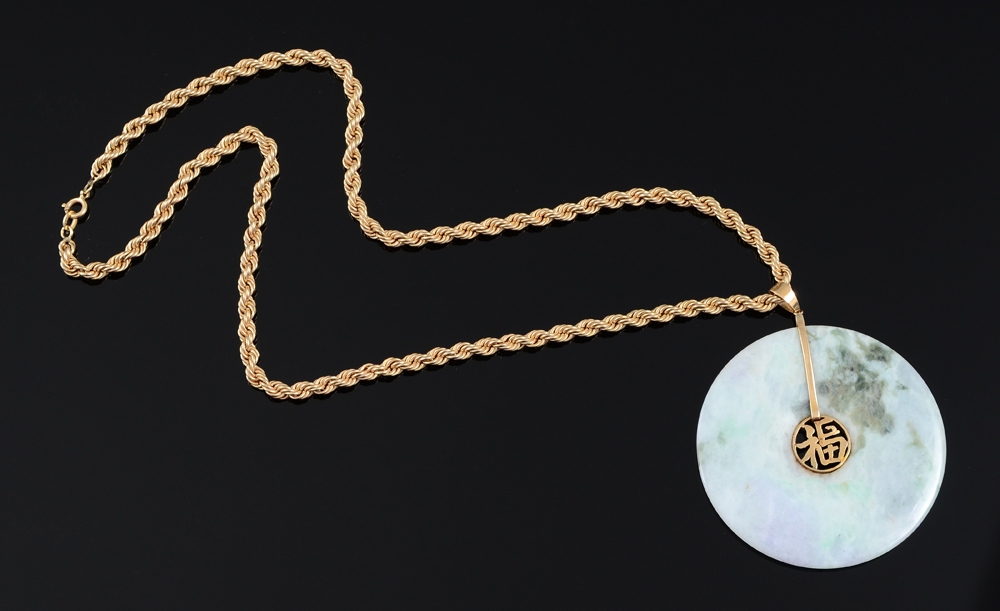 JADEITE JADE DISC PENDANT & GOLD CHAIN: 14k yellow gold mounted jadeite jade disc pendant, 50 mm dia., mottled green and purple in color. 18'' hollow rope chain is 14K gold. Gold weight approx. 9.5 grams.