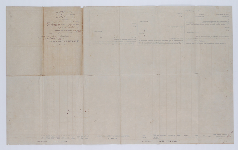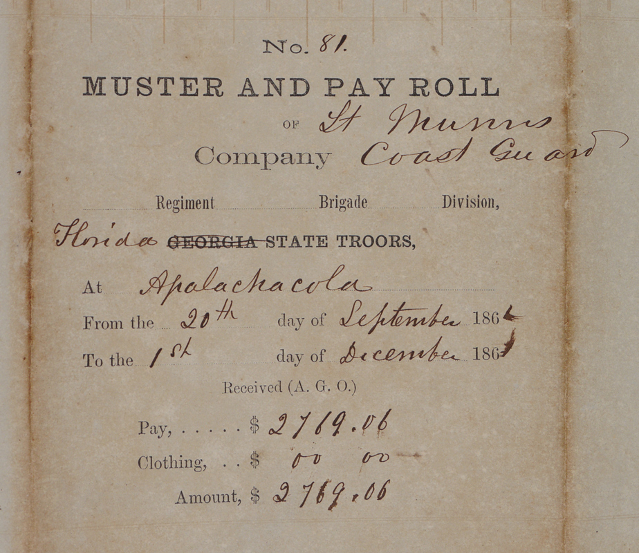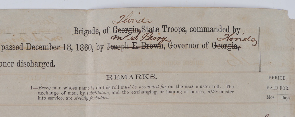 FLORIDA CONFEDERATE CIVIL WAR MUSTER ROLL: Dated from Sept. 20, 1861 to Dec. 1st, 1861, for Lt. Munns Coast Guard Regiment out of Apalachicola for the State of Florida. This document dates so early in the War that Florida had not yet printed it's own muster and pay rolls, thus this is actually a Georgia pay roll with Georgia crossed out. Overall measures 17'' x 28'' opened.
