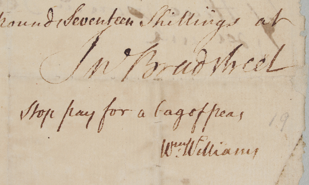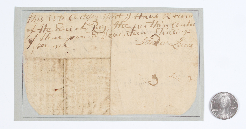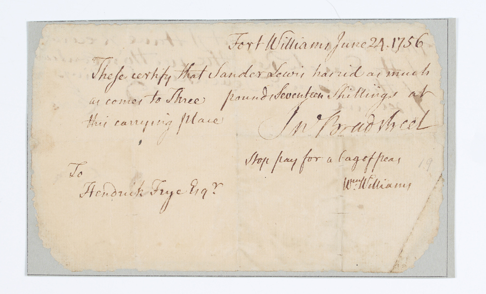 JOHN BRADSTREET (1711-1774) PAY RECEIPT: From the original Early American Numismatics 1993 catalog: ''Dated June 24, 1756, 6 1/4'' x 3 3/4''. The location of issue is Ft. Williams, and in addition to John Bradstreet's bold signature is a slightly smaller signature of William Williams, which is believed to be the same as the William Williams, signer of the Declaration of Independence.'' John Bradstreet rose to the rank of Major-General. Attached to card, the signature of Sander Lewis, the payee, is attached verso. Card measures 6 1/2'' x 4''.