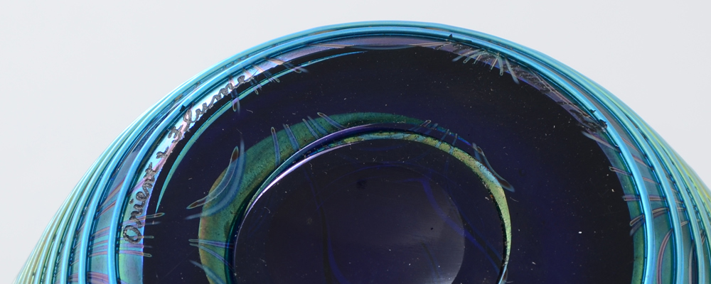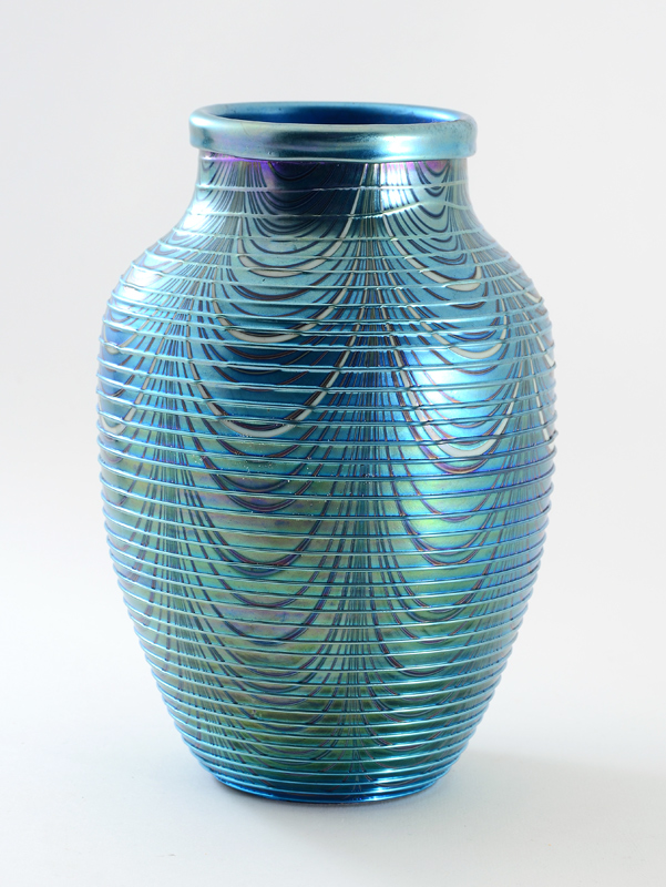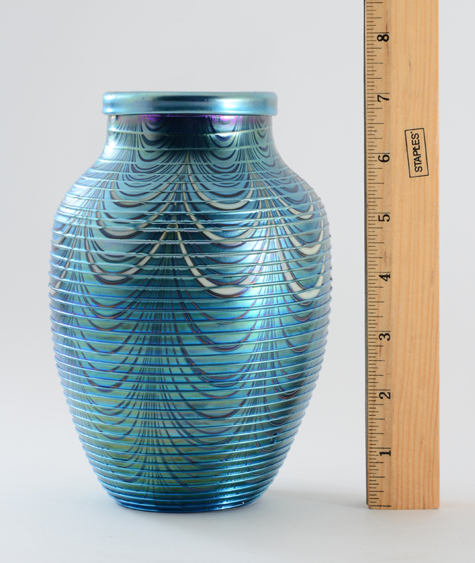 ORIENT & FLUME IRIDESCENT THREADED ART GLASS VASE: Iridescent blue glass with pulled design applied spiral threaded decoration. Signed on base Orient & Flume, 1979 July 125, measures 7 1/4'' h. x 5''.