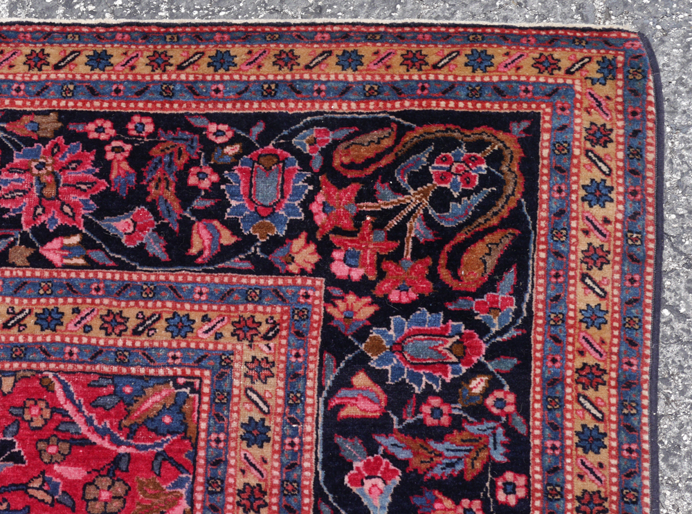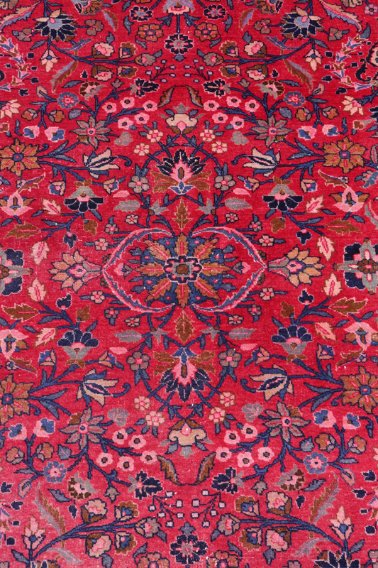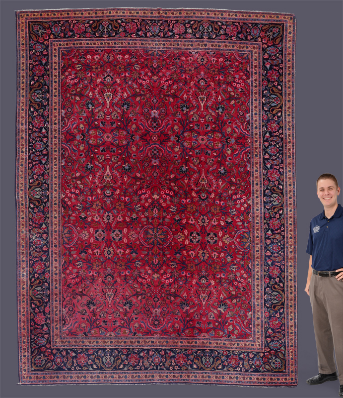 SEMI-ANTIQUE PERSIAN HAND KNOTTED WOOL RUG, 9'4'' x 12': This Persian city rug is a finely woven example with a red field covered by an overall pattern of sprays of flowers of various types and sizes radiating out from a central anchoring row of motifs. The deep blue ground of the main border frames the field.
