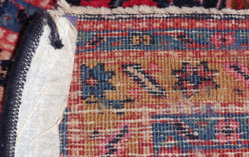 CONDITION: There is some color run, some areas of wear, and the selvedges have been redone (one by machine, one by hand).