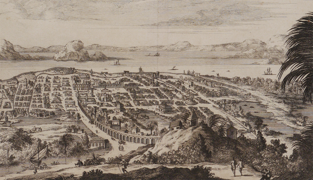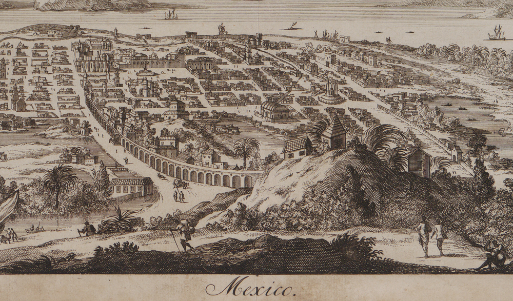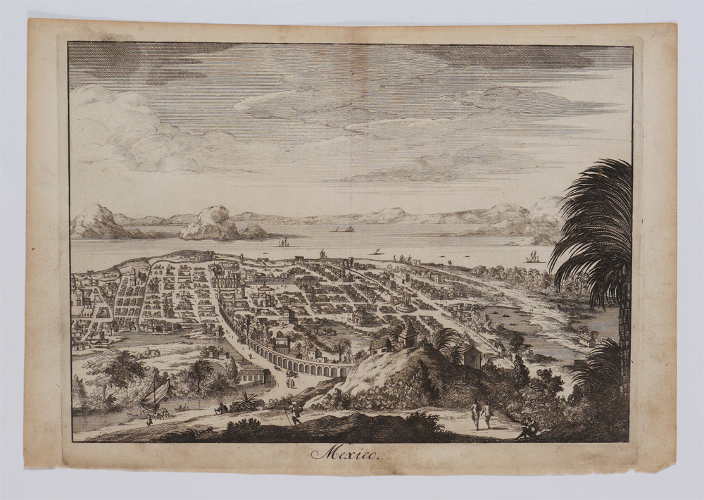 1705 VIEW OF MEXICO CITY ENGRAVING: From the ''Algemene Wereldtbeschrijving'' by Francois Halma, circa 1705. Overall measures 8 1/4'' x 12 1/4''.