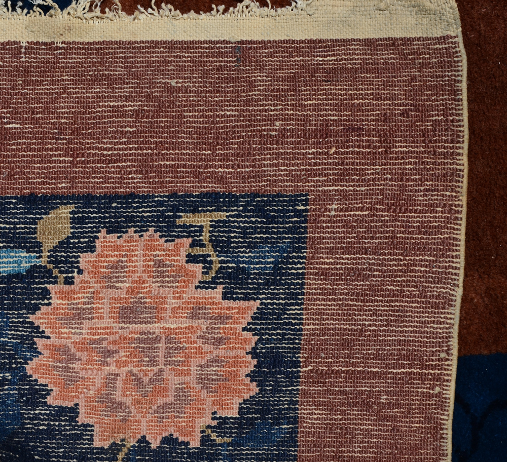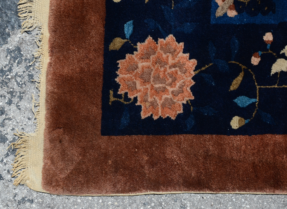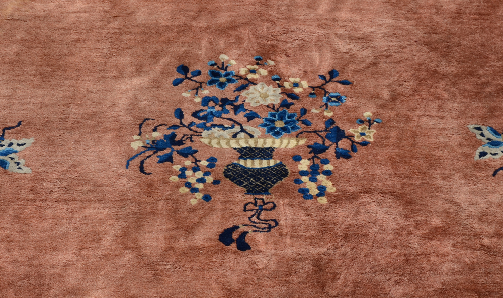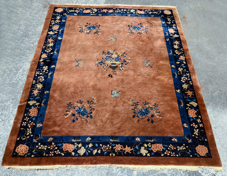 APPROX 65/85 YR OLD CHINESE HAND KNOTTED WOOL RUG, 9' 1'' x 11' 8'': A fine example of a Nichols Chinese rug with its artful use of a limited palette of colors and well placed, well-chosen motifs. The velvety looking light mink colored field has a blue vase with flowers in its center. Around this butterflies fly around and towards the corners of the field are sprays of blue flowers. The blue borders and the light mink outer band complete the picture.