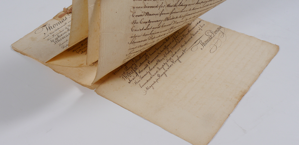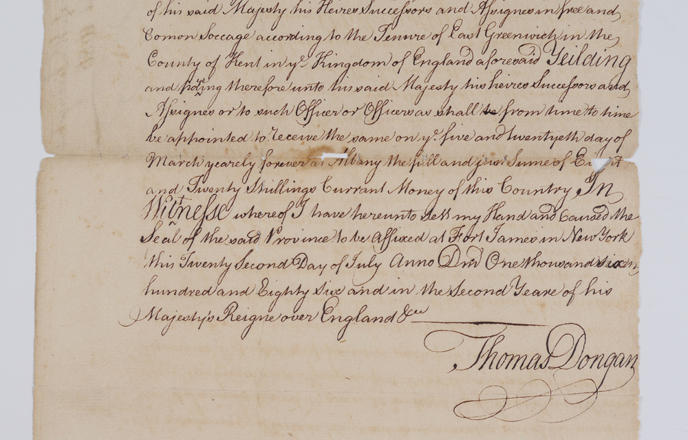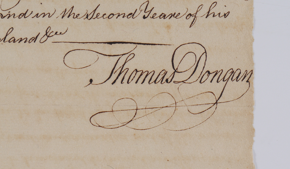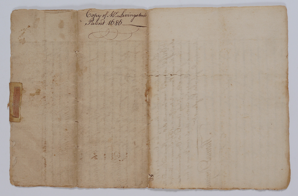 ROBERT LIVINGSTON 1686 NEW YORK LAND GRANT: From the 1999 Early American History Auction catalog: ''18th Century copy of Governor Thomas Dongan's 1686 grant of a large tract of land to Robert Livingston, comprising large parts of wht is now Dutchess and Columbia counties, 7 pages, 12'' x 8''.'' Tied together at top with ribbon.
