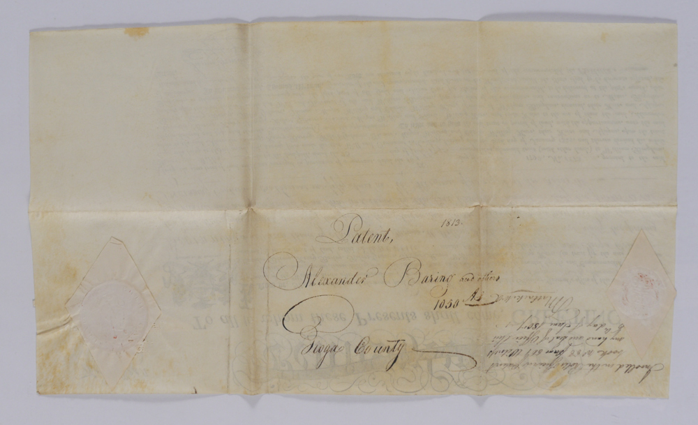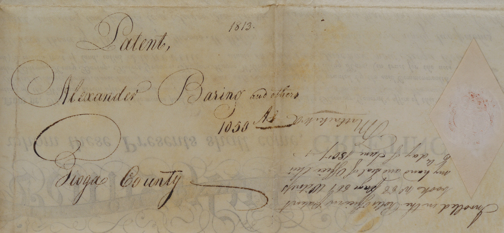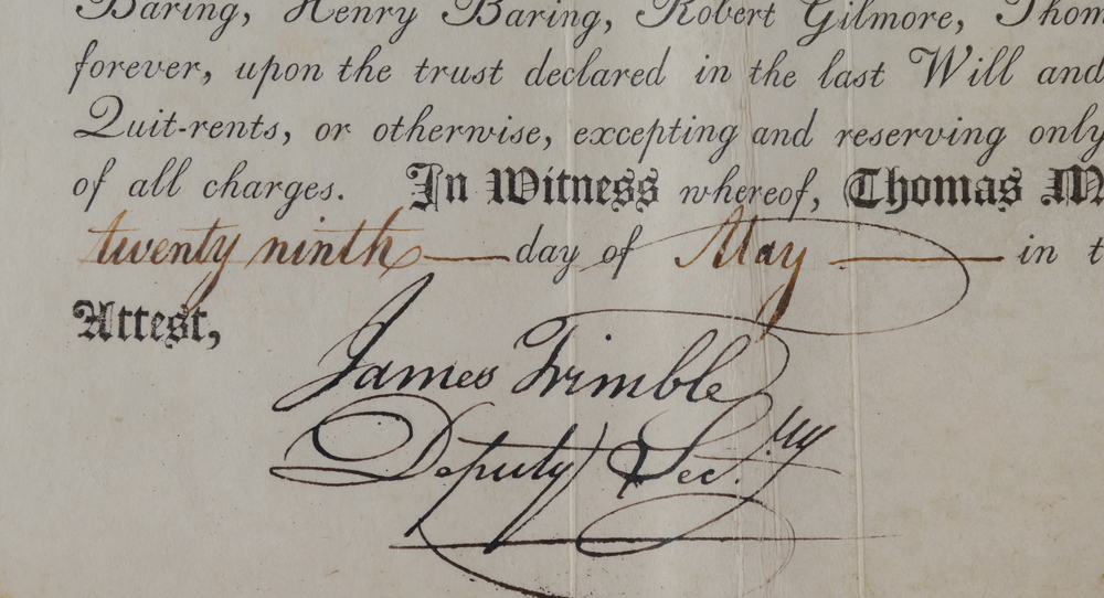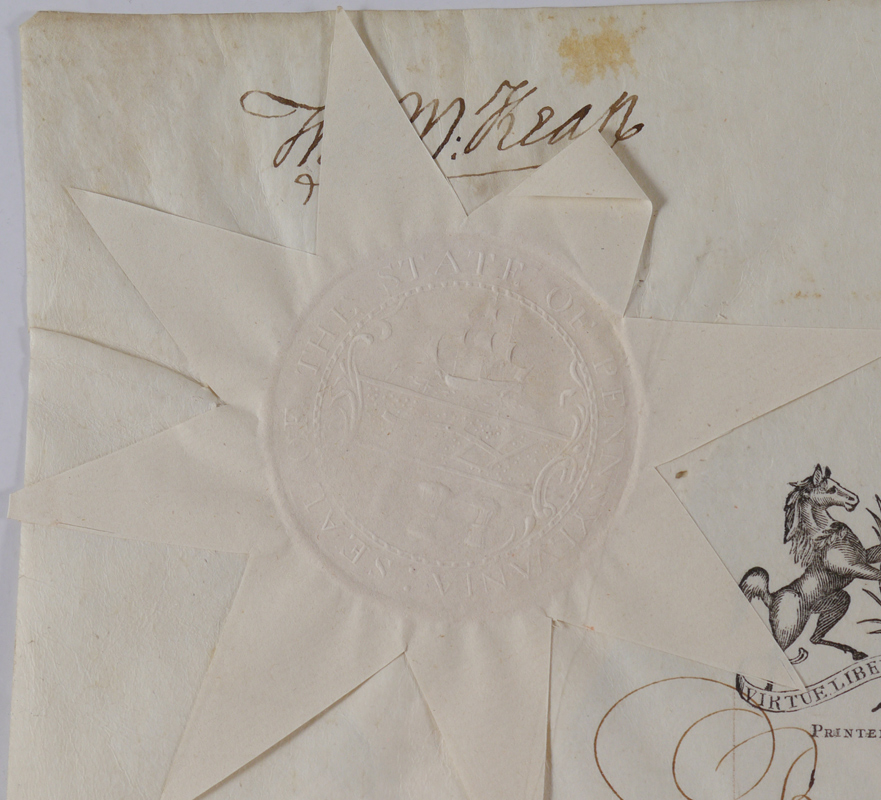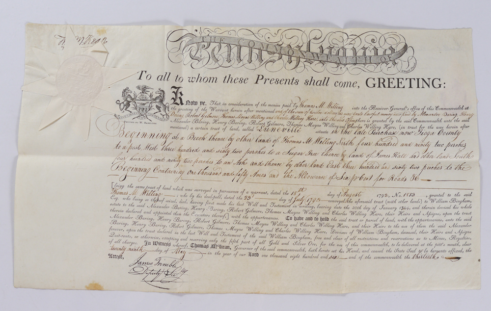 THOMAS MCKEAN SIGNED VELLUM DOCUMENT: From the original 1997 Early American History Auctions catalog: ''Document signed, ''Tho M:Kean'', as Governor of Pennsylvania, vellum, May 29th, 1806, Pennsylvania, 11 3/4'' x 20 3/4'', Very Fine. Counter signed by the Commonwealth Secretary and on verso, docketed by ''T(imothy) Matlack'', engrossed of the Declaration of Independence. Partly printed and accomplished in manuscript, Embossed white paper and wax state seals, clean and fully intact. Light toning. Impressive signature 2 1/4''in length. Clear, sharp dark ink. Being a land grant to Alexander Baring, Henry Baring, Robert Gilmore, Thomas Mayne Willing and Charles Willing Hare, for ''a certain tract of land called 'Luneville' situate in Tioga County''.''