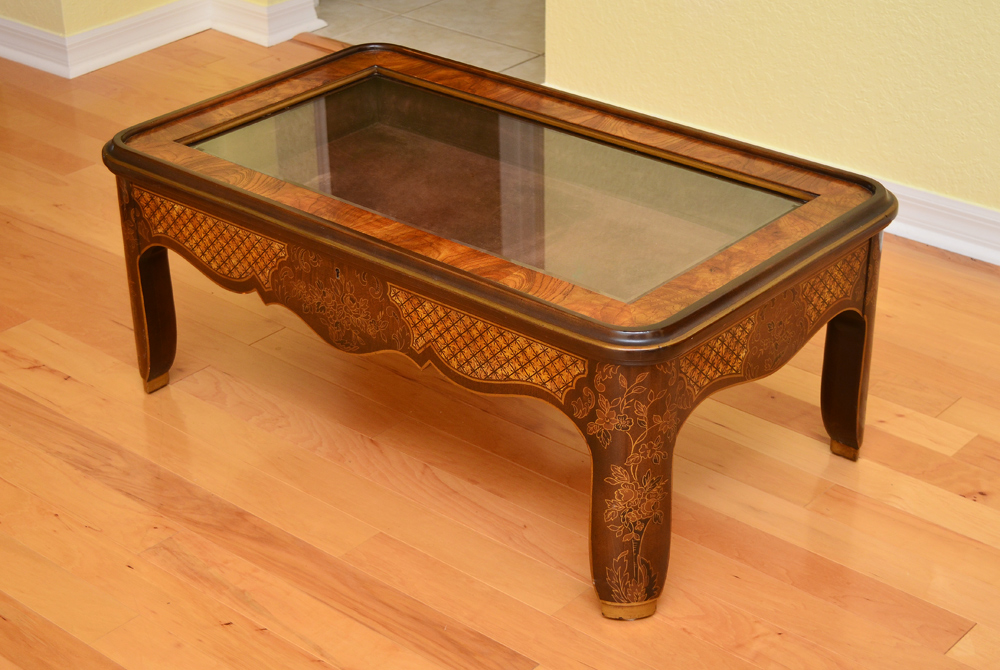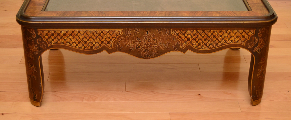 DREXEL DECORATIVE DISPLAY TABLE: Lift top with beveled glass, paint decorated shaped skirt and sides, velvet lined interior. Measures 16 3/4'' x 40'' x 24 1/4''.