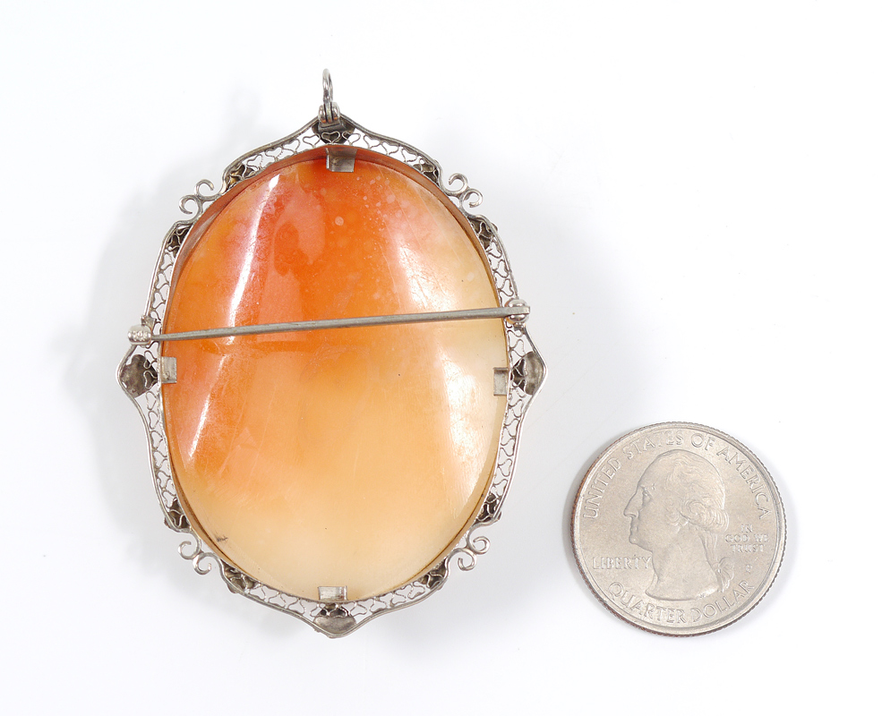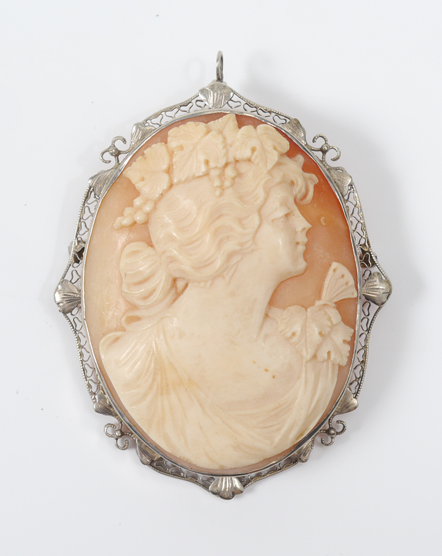 LARGE 14K WHITE GOLD FRAMED CAMEO PENDANT / BROOCH: Shell carved depiction of a wavy haired beauty with grapes and leaves in her hair and butterfly on her shoulder. Filigree frame. 2 1/8'' x 1 3/4''.