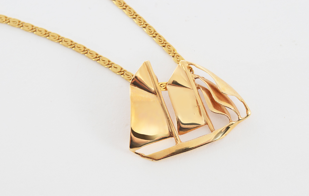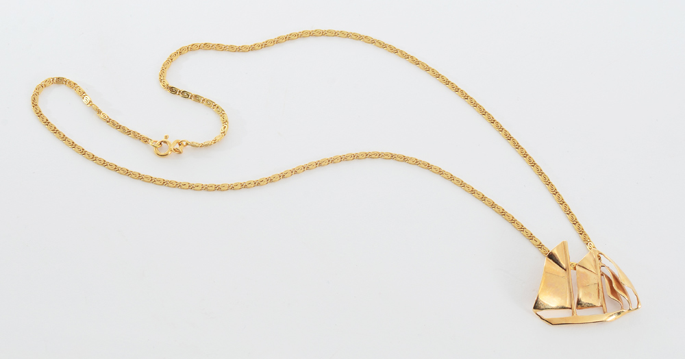 GOLD SAILING YACHT PENDANT NECKLACE: 18K yellow gold 18'' chain with a 14K gold figural pendant, 1'' x 1.25''. 18K weight 9.4 grams. 14K weight: 5.3 grams.