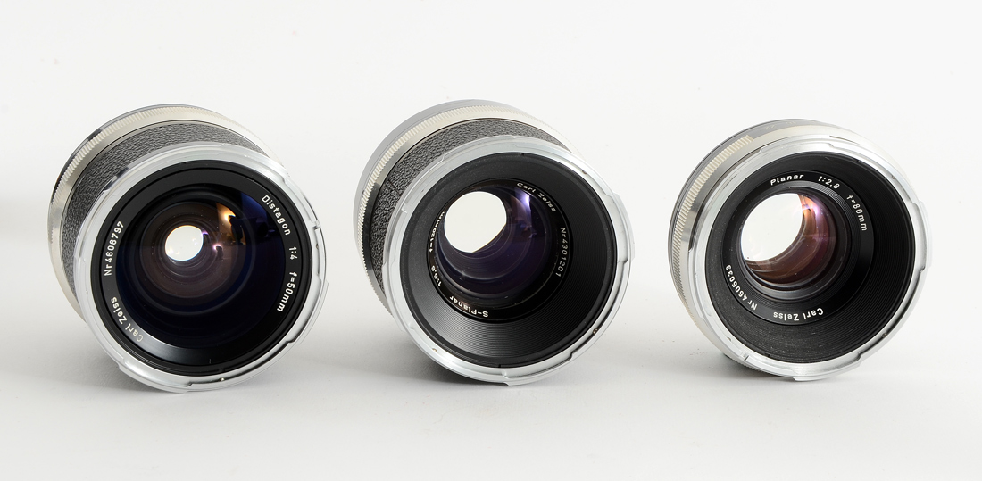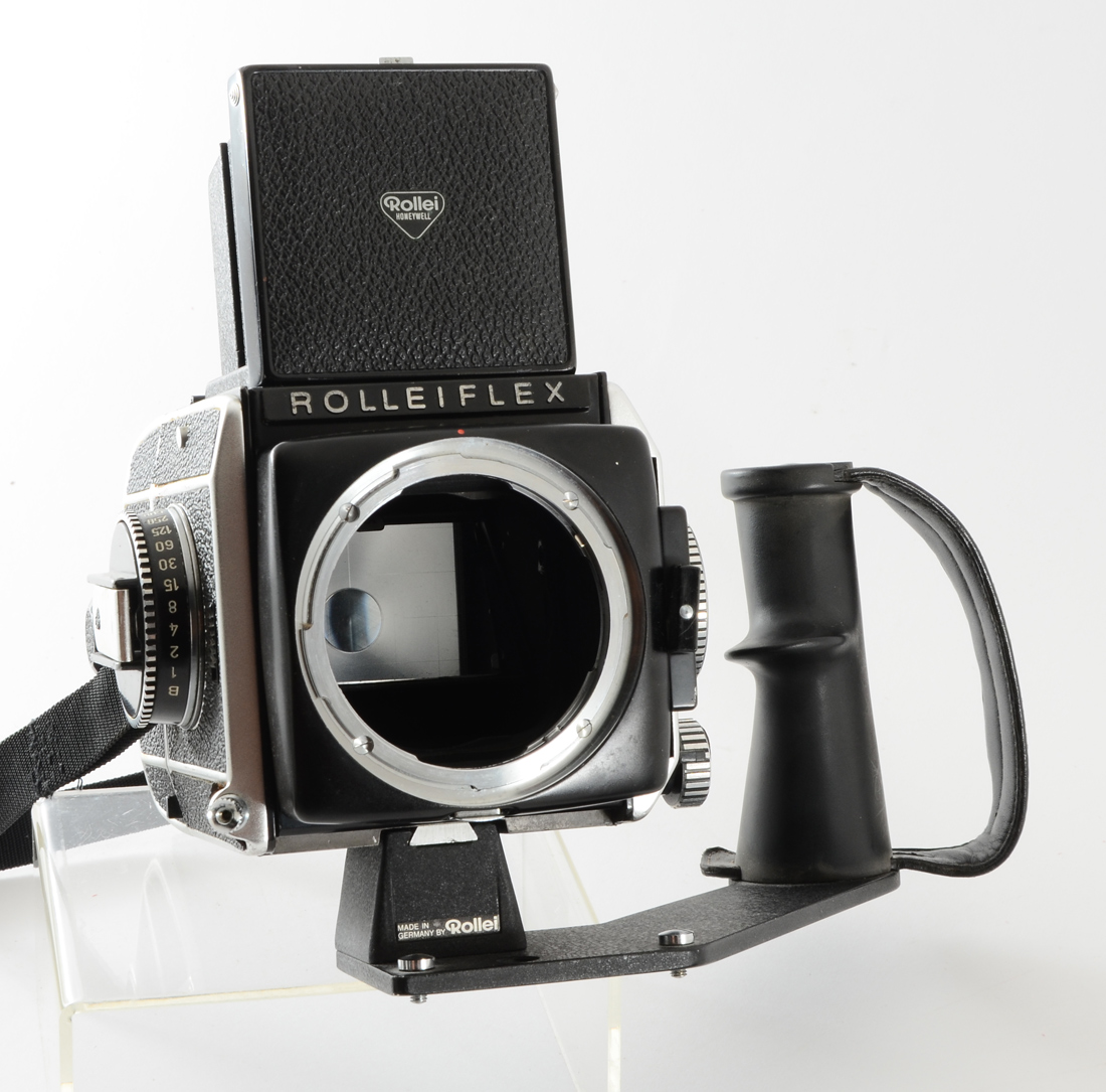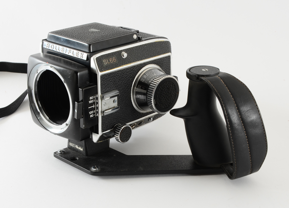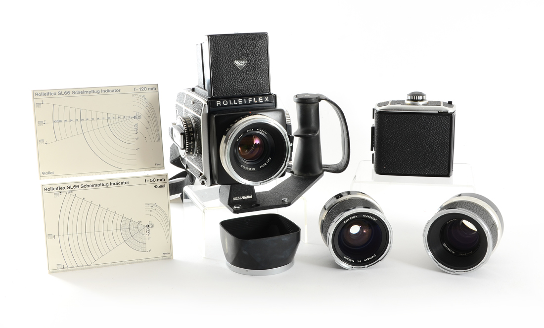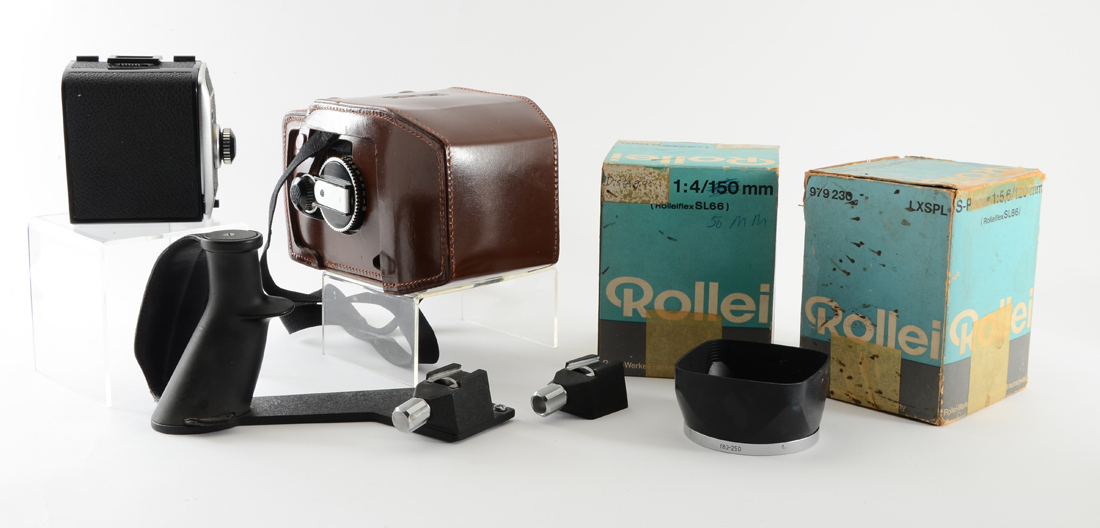 ROLLEIFLEX SL66 CAMERA W/ 3 LENSES: This camera is a model SL66, serial #2904564, that comes with an additional film holder backing, an original leather Rollei camera case in good condition, as well as a grip/support bracket. Lenses included are: 1) Carl Zeiss Planar 80mm f/2.8, serial #405033. 2) Carl Zeiss S-Planar 120mm f/5.6, serial #4301201, includes box. 3) Carl Zeiss Distagon 50mm f/4 wide-angle lens, serial #4608797. These lenses are difficult enough to find; having three highly rated lenses together in one collection is a exceptional find.