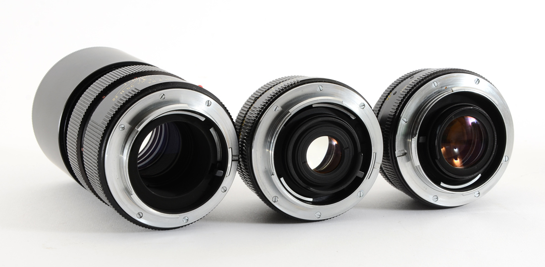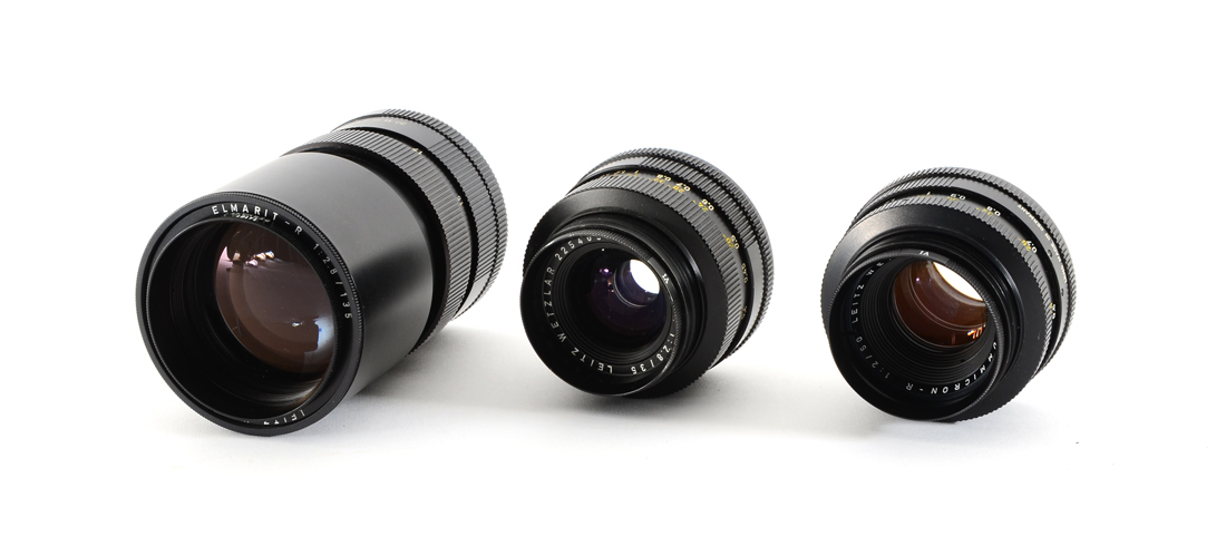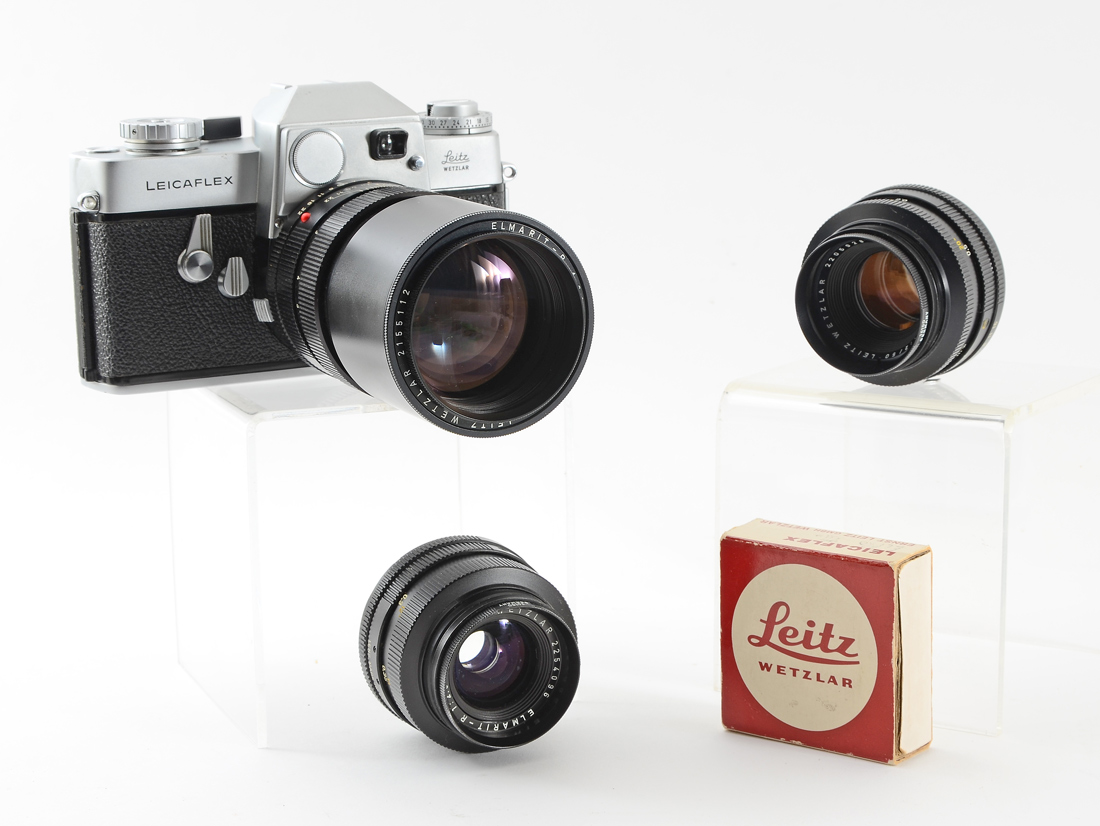 LEICAFLEX 35MM SLR W/ 135MM, 50MM, and 35MM LENSES: Lot includes: 1) Leicaflex chrome body SLR, serial #1168450, 1967 date of manufacture. 2) Leitz Wetzlar Elmarit-R 135mm f/2.8 medium telephoto lens, serial #2155112, 1965 date of manufacture. 3) Leitz Wetzlar Summicron-R 50mm f/2.0 standard lens, serial #2205928, 1966 date of manufacture. 4) Leitz Wetzlar Elmarit-R 35mm f/2.8 wide-angle lens, serial #2254096, 1967 date of manufacture.