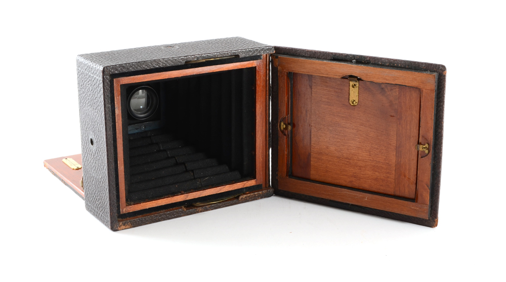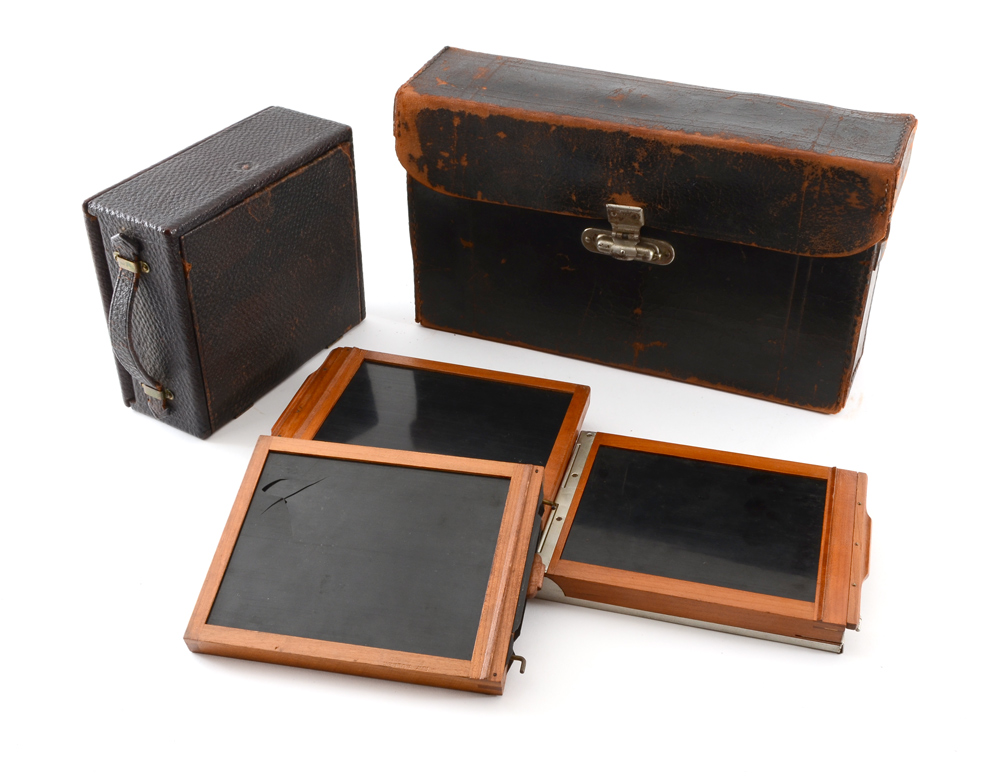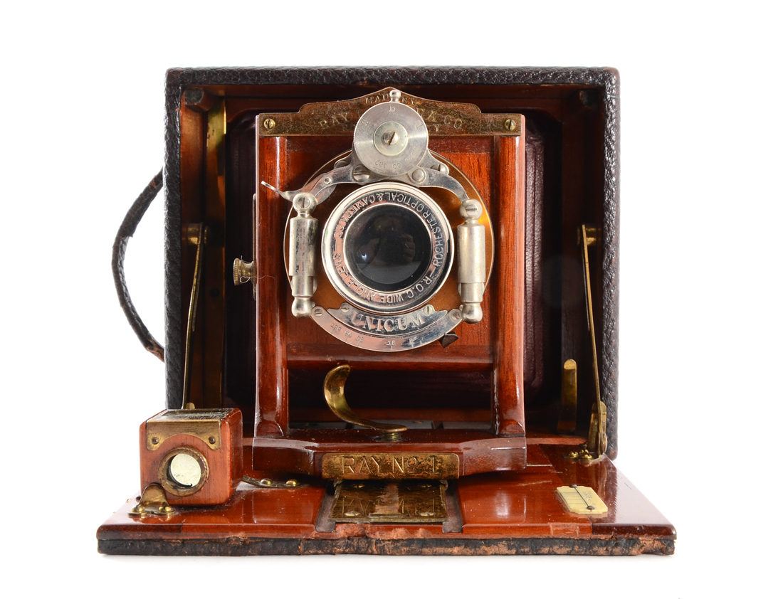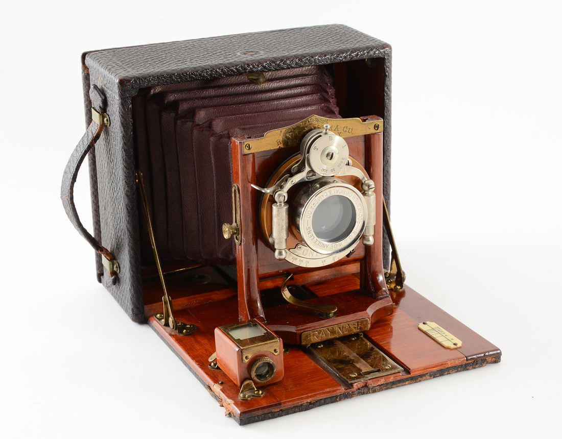 RAY MODEL NO. 1 4x5 CAMERA: Slide camera manufactured between 1894 and 1899 by Ray Camera Company out of Rochester, NY, the home of Eastman-Kodak. This is a very small example of a large format 4x5 camera, and comes equipped with a Bausch & Lomb wide-angle lens of unknown focal length, f/8 aperture. Camera comes in original leather box with 4 film pack adapters.