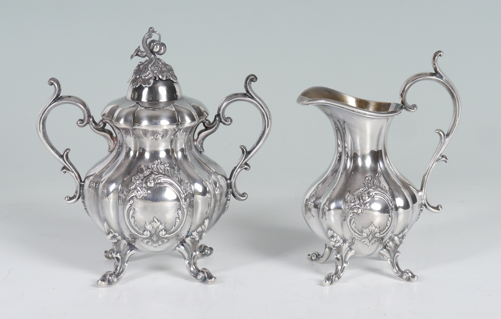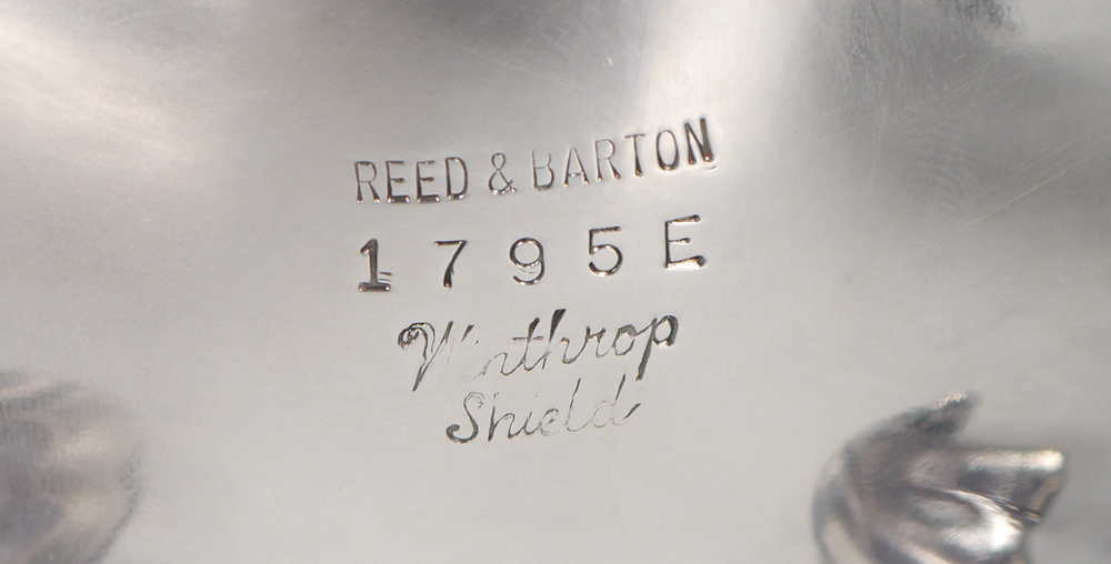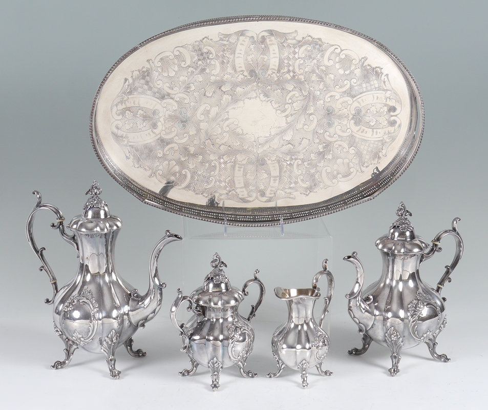 REED & BARTON WINTHROP SHIELD SILVERPLATE TEA SERVICE: 5 pieces total, 4 piece tea service in the ''Winthrop Shield'' pattern by Reed & Barton to include 1) Coffee pot, 12 1/4'' h. x 11 1/4''. 2) Teapot, 10 3/4'' h. x 9 1/2''. 3) Covered sugar, 8'' h. x 7 3/4''. 4) Open creamer, 7 1/4'' h. x 5 1/2''. Sold with 5) English silverplate tray with pierced gallery, 2'' h. x 22'' x 14''.