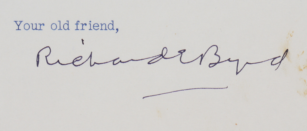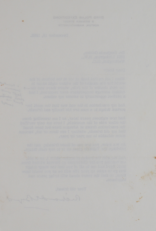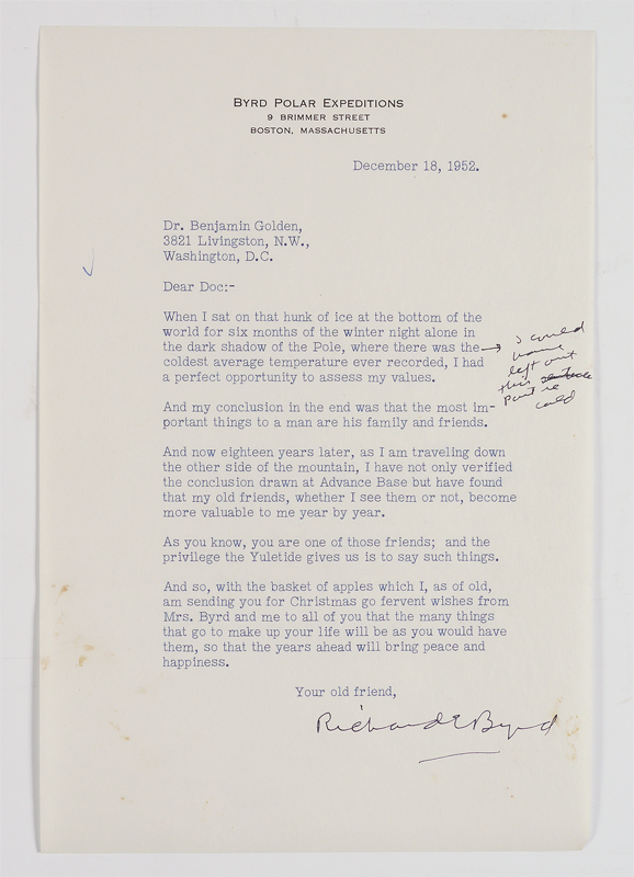 RICHARD BYRD SIGNED LETTER ON BYRD LETTERHEAD: From the original 1995 Early American Numismatics auction catalog: ''Famous Explorer, first to reach the South Pole. Typed letter signed on Byrd Polar Expeditions stationary, Boston MAss, Dec. 18, 1952, a letter sending Yuletide greetings to his friend Dr. Benjamin Golden. Extremely Fine, tri-folded, on fine bond paper, nice and bright, with a bold signature.'' 10 1/2'' x 7 1/4''.