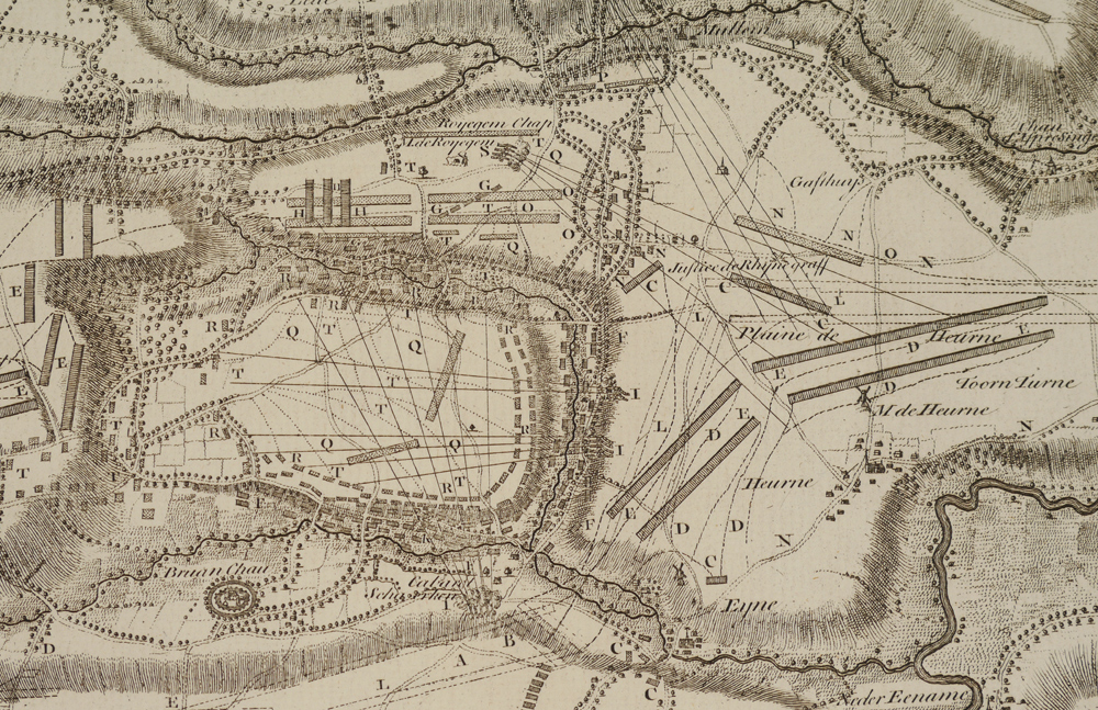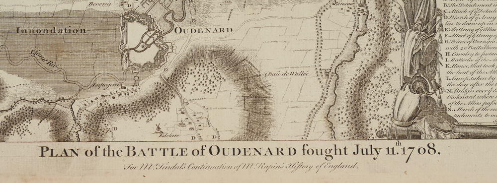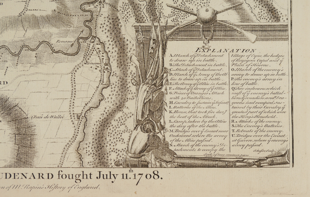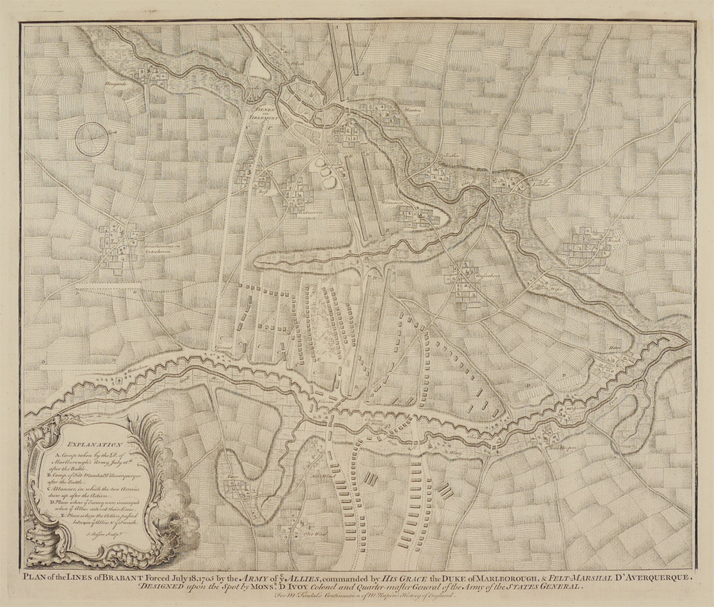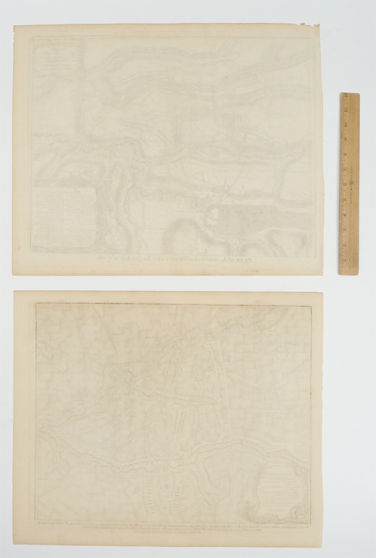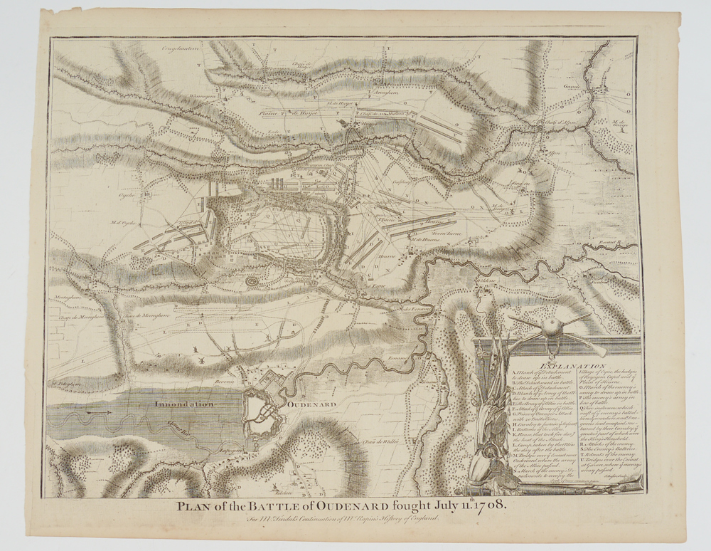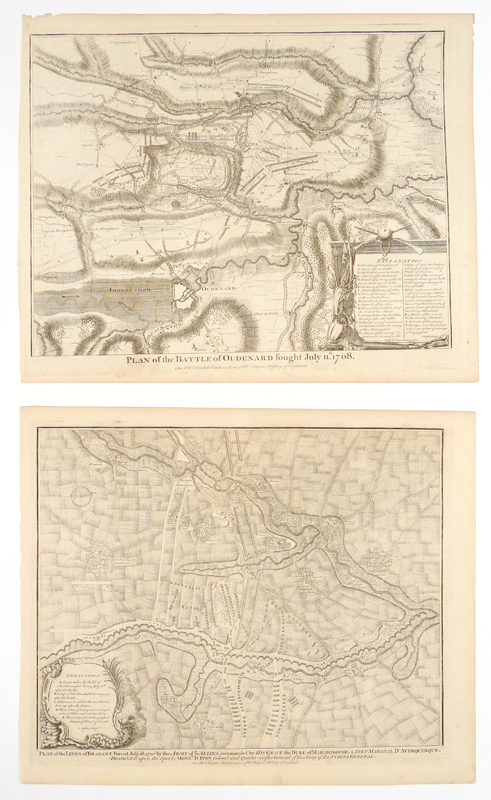 2 PIECE 18TH CENTURY ENGLISH BATTLE PLANS: From the original 1997 Early American History Auctions catalog: ''1) c. 1725, Plan of the Battle of Oudenard Fought July 11, 1708, 14 1/4'' x 19'', uncolored, I. Basire, sculptor. ''For Mr. Tindal's Continuation of Mr. Rapin's History of England''. Troop positions are contained in a cartouche decorated with armour, musical instruments, and weaponry. A detailed depiction of one of the battles of Queen Anne's War; 2) c. 1725, Plan of the Lines of Brabant Forced July 18, 1705 by the Army of Ye Allies, Commanded by his Grace the Duke of Marlborough & Felt-Marshal D'Averquerque, by I. Basire, 14 1/4'' x 18 1/4'', uncolored. ''Designed upon the spot by Monsr. D. Ivoy Colonel and Quarter-master General of the Army of the States General for M. Tindal's Continuation of M. Rapin's History of England.'' Decorative cartouche holds information on troop locations.'' Each measures 16 3/4'' x 20 1/2''.