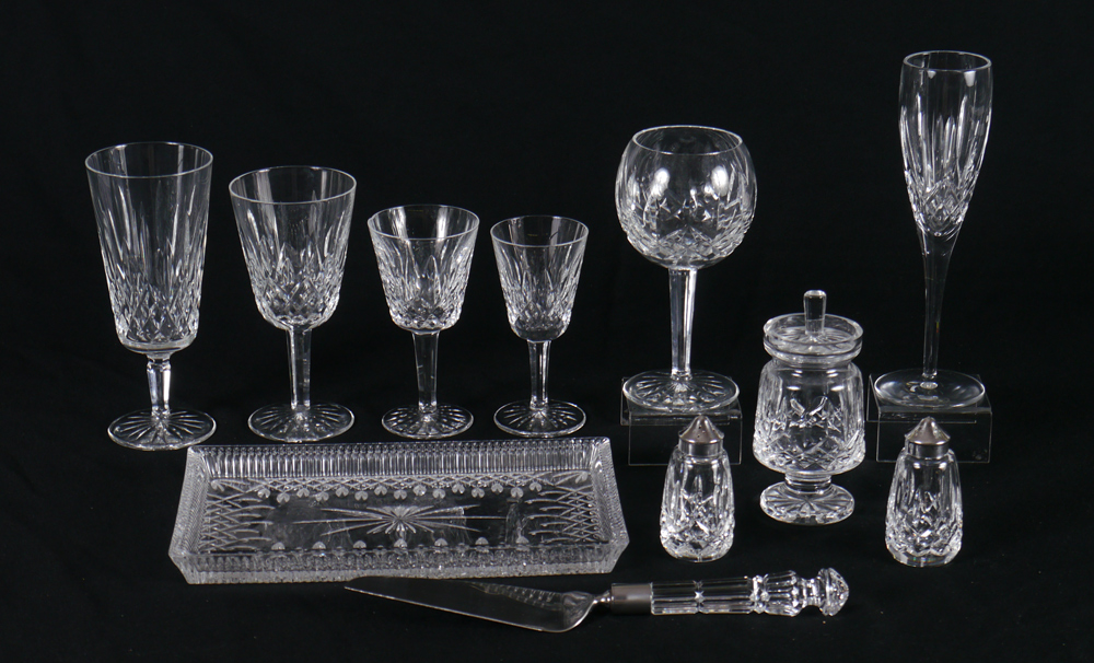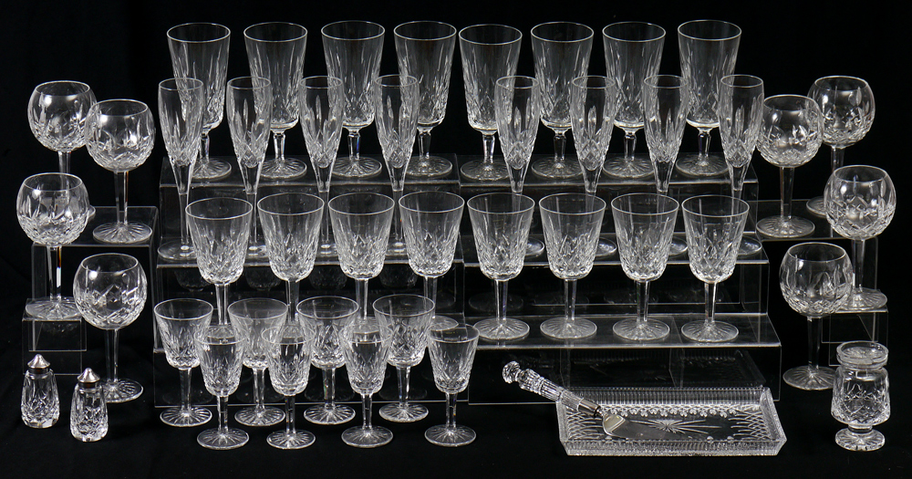 WATERFORD CRYSTAL LISMORE STEMWARE SET: Approx. 44 pieces in the Lismore pattern to include 8 water goblets (6 7/8''), 8 tall iced tea (7 3/4''), 8 balloon wine (7 1/4''), 8 champagne (9 1/4''), 4 claret wine (5 7/8''), 4 white wine (5 1/2''), jam jar with lid, salt and pepper shakers, tray with original box, pie/cake server with stainless blade.