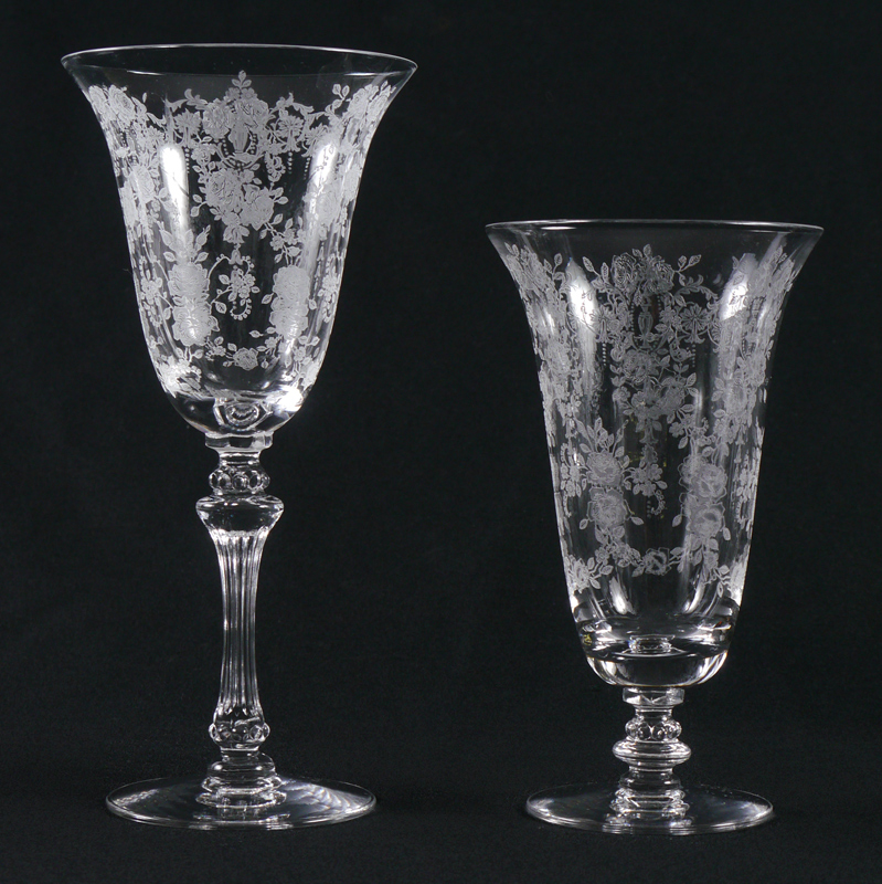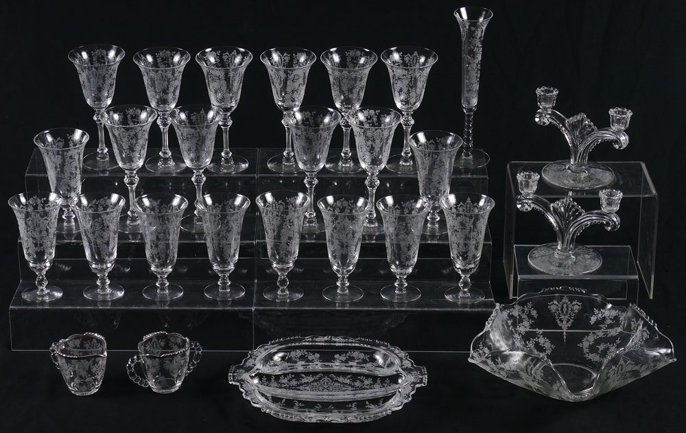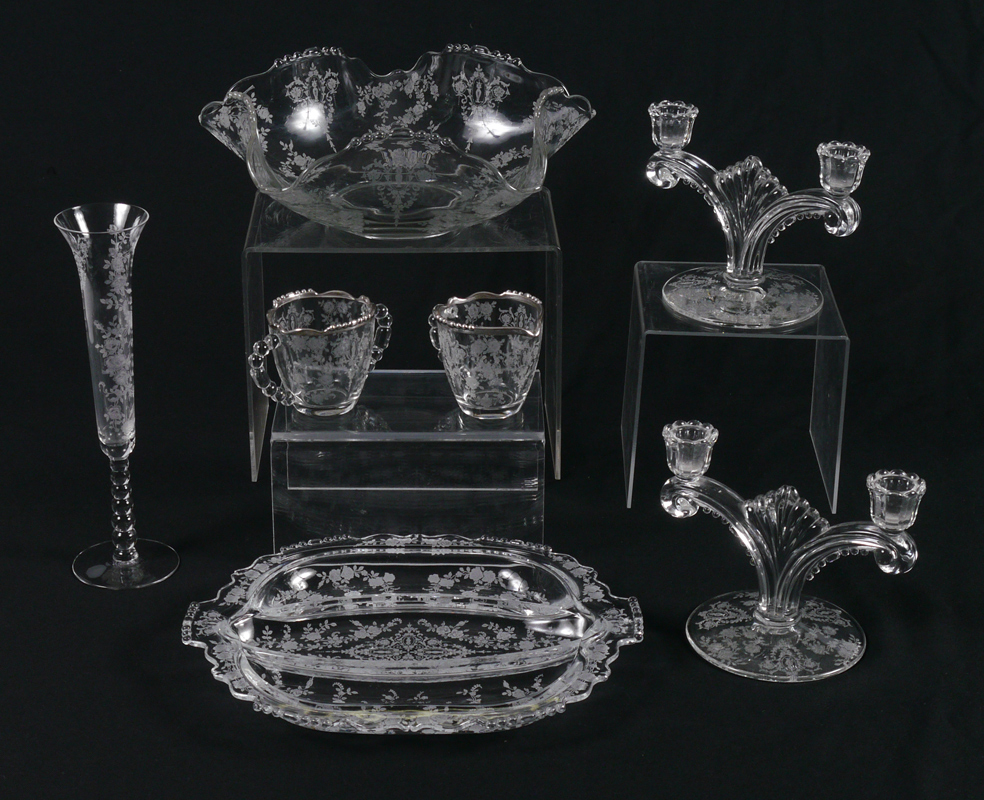 TIFFIN CHEROKEE ROSE ETCHED GLASS SUITE: Approx. 28 pieces in the Cherokee Rose pattern by Tiffin to include 10 water goblets (8 1/8), 10 wine (6 3/8''), bud vase (10 5/8''), pair double light candle stands (5 5/8'' h.), handled 3 part relish dish (12 1/4'' x 10 3/4''), metal mounted open cream and sugar, crimped center bowl (4 3/4'' x 12).