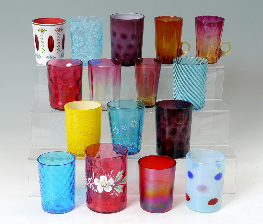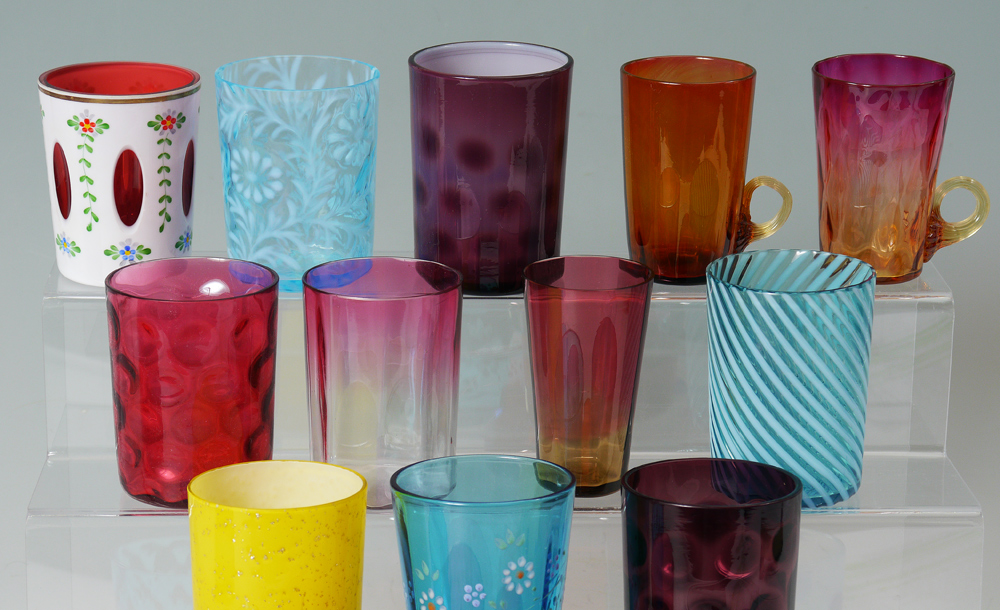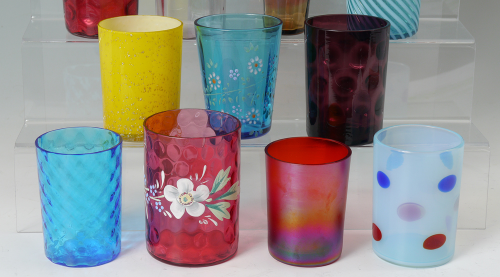 VICTORIAN TUMBLER ART GLASS COLLECTION: 16 piece group to include cranberry, rubina, amberina, iridescent, enameled, and Bohemian cut to cranberry, and opalescent. Measures 3 1/2'' - 4 1/2''.