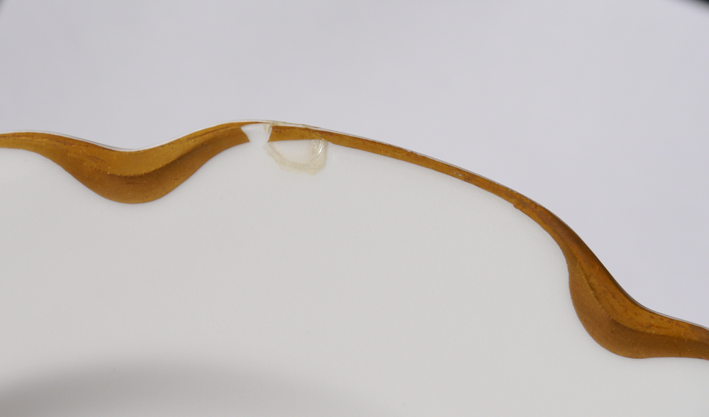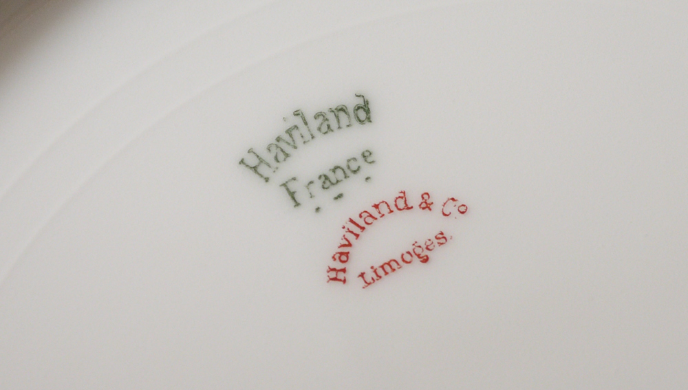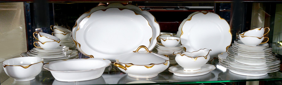 FRENCH HAVILAND LIMOGES GOLD RIM FINE CHINA: Ca. 1893-1930. Gold rim fine white china, approx. 43 pieces to include 8 dinner plates (9 1/2''), 5 salad plates, 6 bread plates, 6 dessert bowls, 7 cups, 7 saucers, gravy, covered vegetable, open vegetable, and the two platters (13 1/2'' - 15 1/2'').
