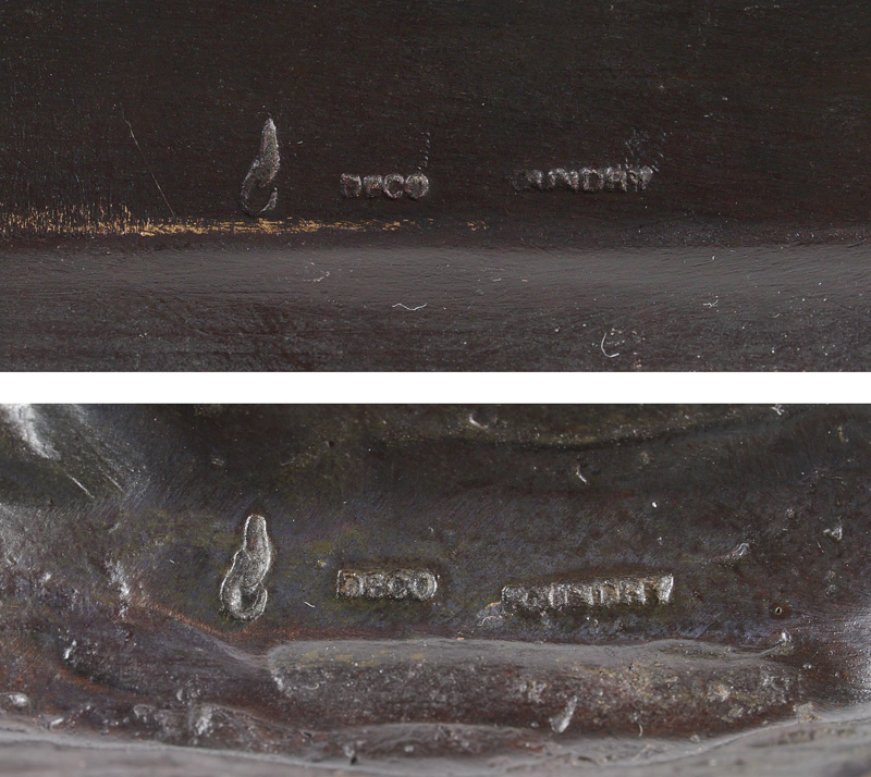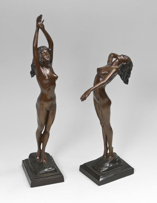 2 NUDE BRONZE FEMALE FIGURES FROM THE DECO FOUNDRY: 1) Stretching up, 21.25''h., base 5 5/8'' x 4. 2) Leaning Back, 16.5''h., fingers to hair 8.5'' and elbow to out flung arm 6'', base 5.5'' x 4 3/8''.