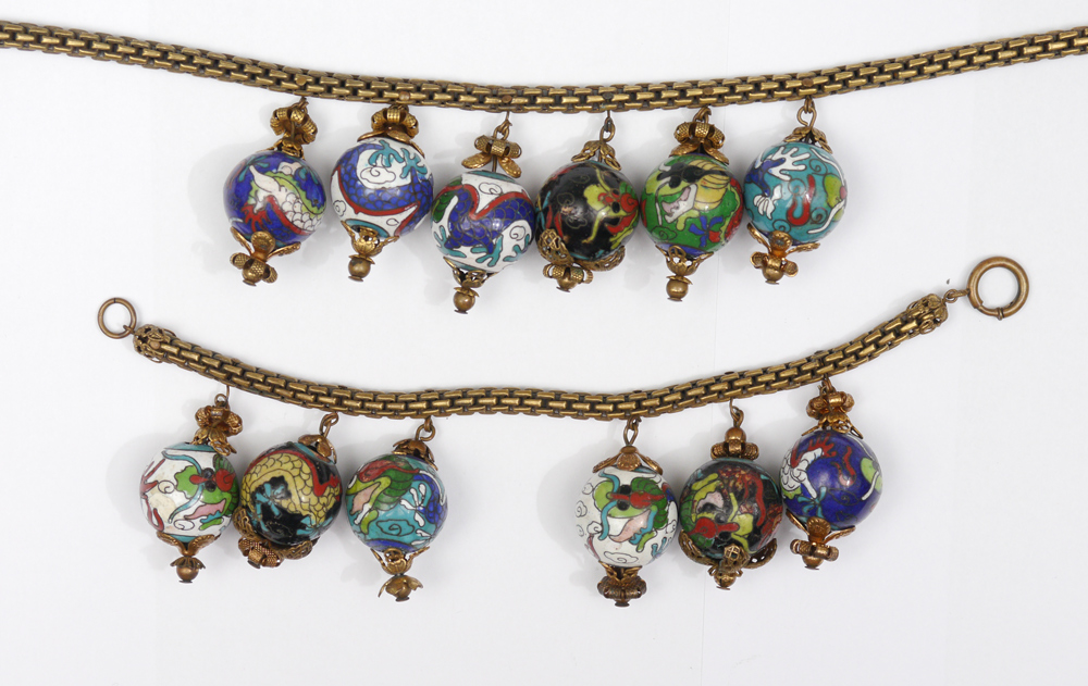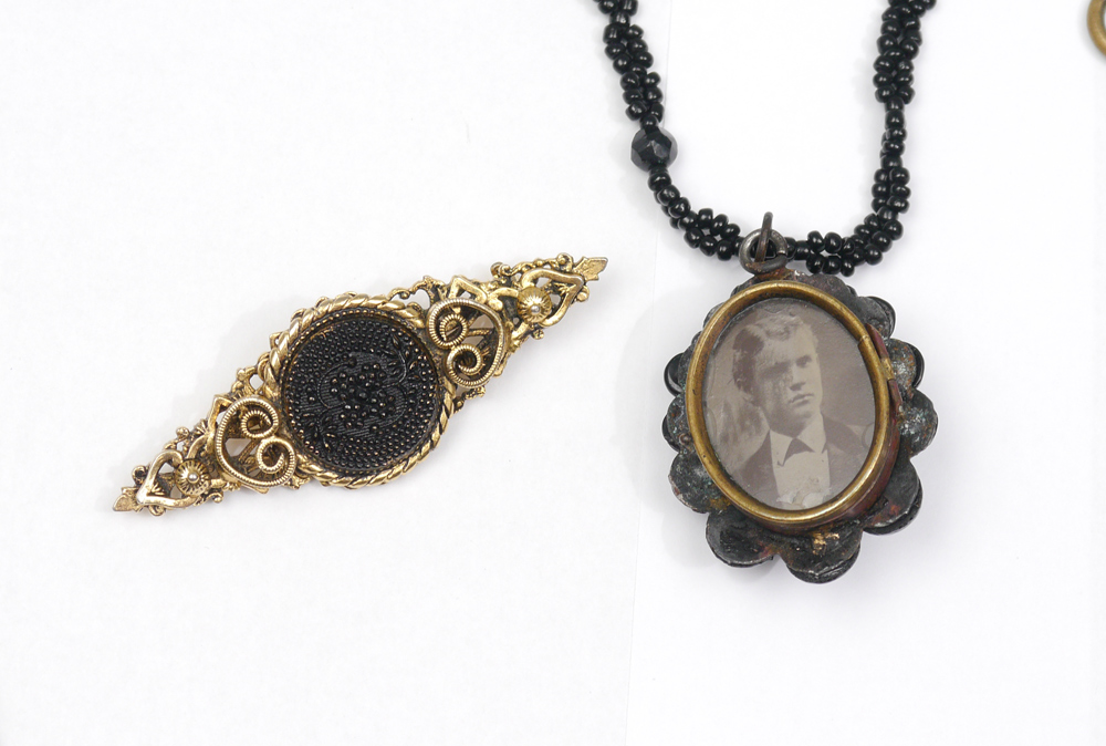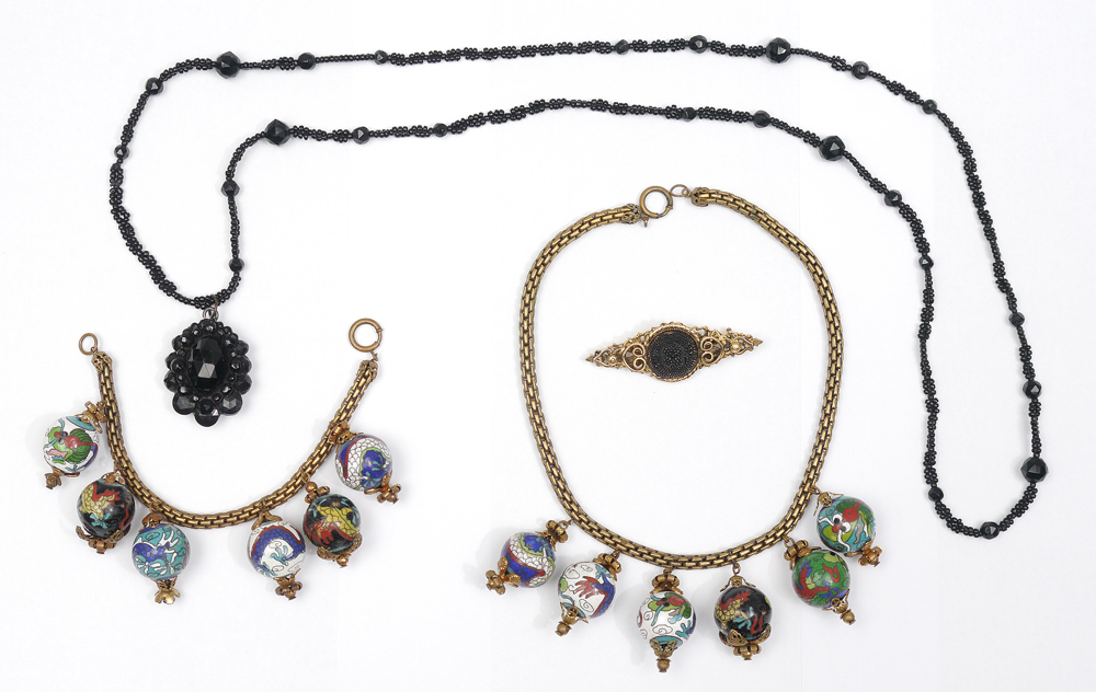 4 PIECE ESTATE JEWELRY LOT: Featuring a jet black bead necklace with mourning pendant holding a photograph of a past love, 40'' strand plus 1 5/8'' pendant. Gold tone metal bar pin centered with black disk, 2.5''l. Matching necklace and bracelet with large cloisonne bead dangles, 6 assorted designs to each. 16''l. necklace, 7''l. bracelet, no mark as to metal content. Sold as a lot.