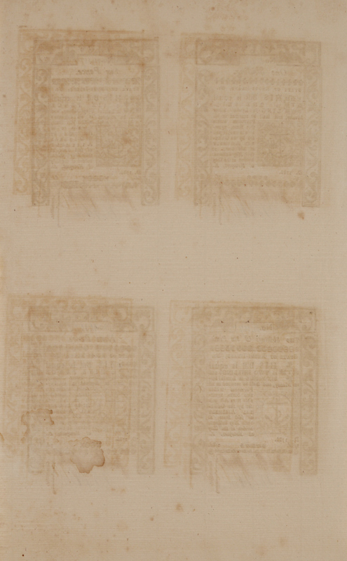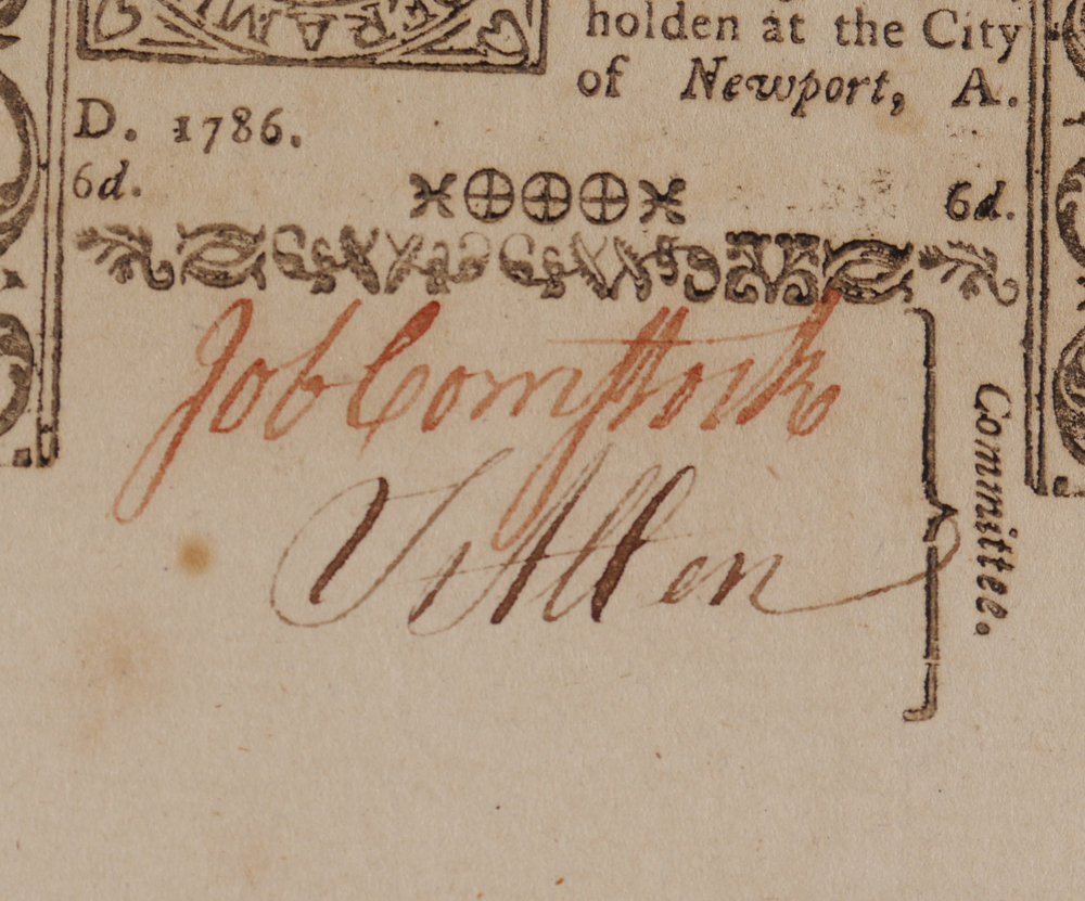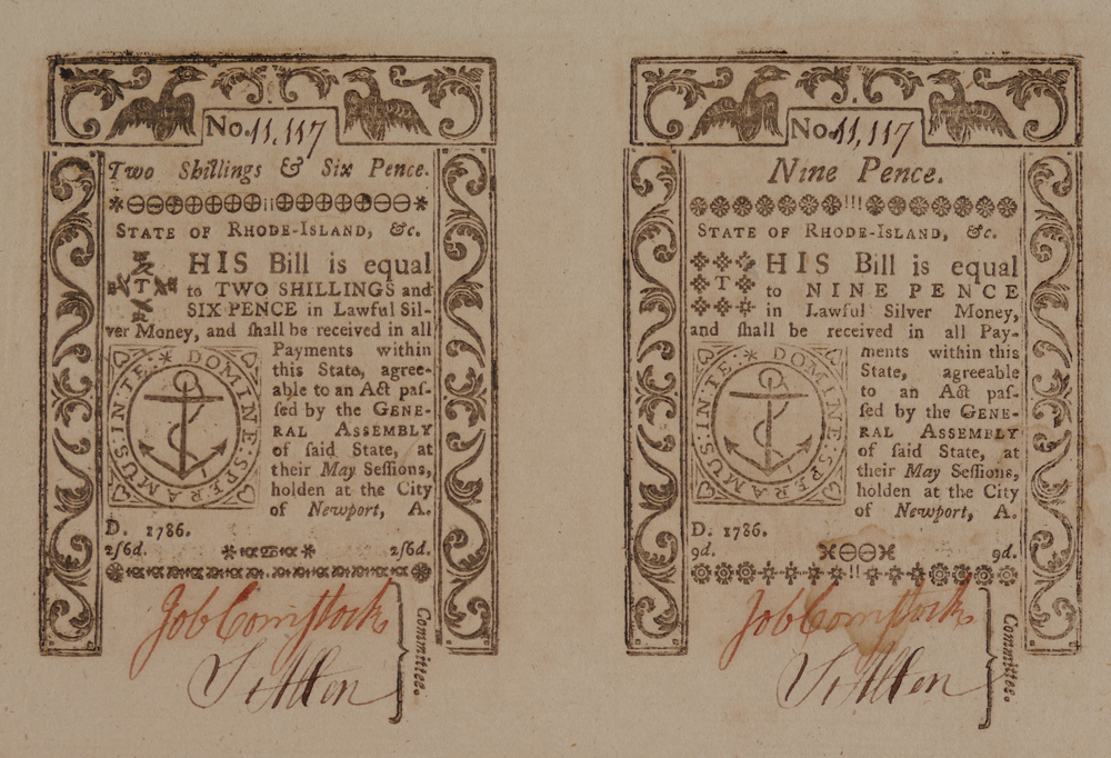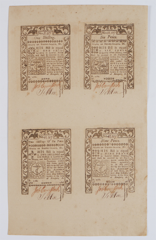 UNCUT SHEET OF 1786 RHODE ISLAND CURRENCY: Full sheet colonial currency from 1786 to include one shilling, six pence, nine pence, two shillings and six pence, numbered 11,117. Ungraded, measures 12 1/2'' x 7 1/2''.