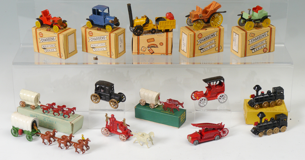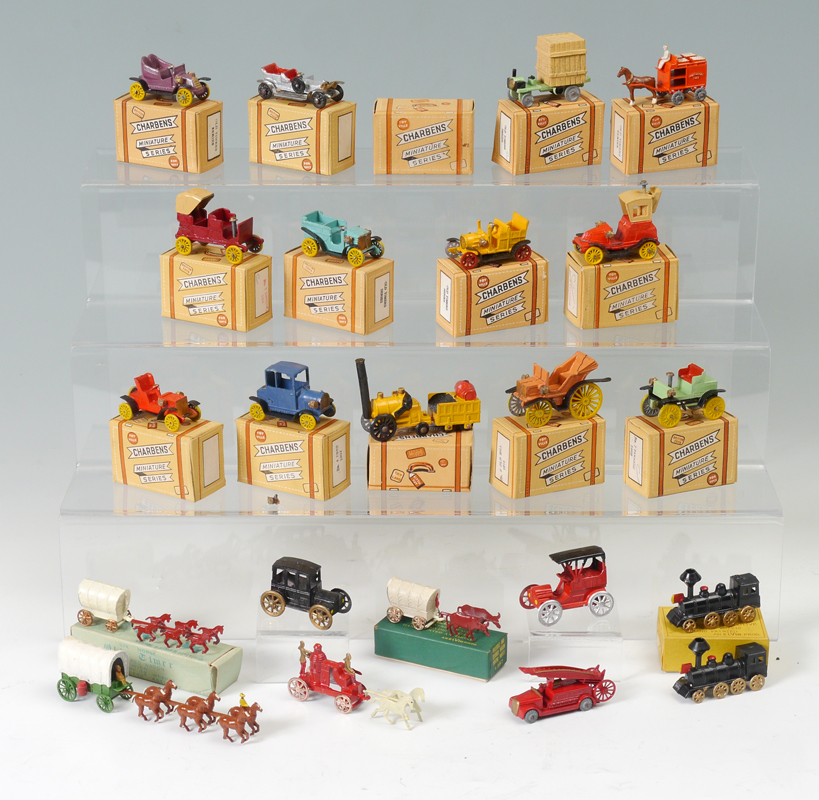 COLLECTION OF CHARBENS MINIATURE CARS & MORE: An assembled collection to include 13 miniature cars in the original boxes plus a dis-assembled Packhard Runabout with box. Sold with several other miniature toys to include horse and wagon, fire trucks, locomotives and more.
