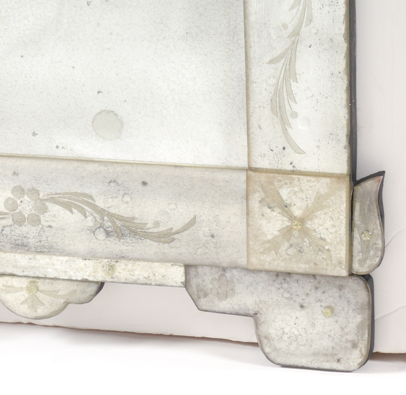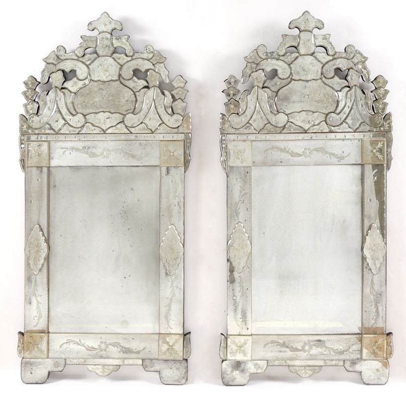 PAIR VENETIAN STYLE MIRRORS: Contemporary Venetian style, antiqued to give the appearance of age. 53'' h. x 25 1/4'' x 1 1/2''.