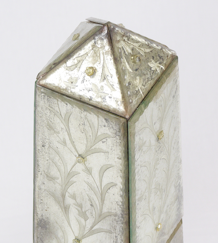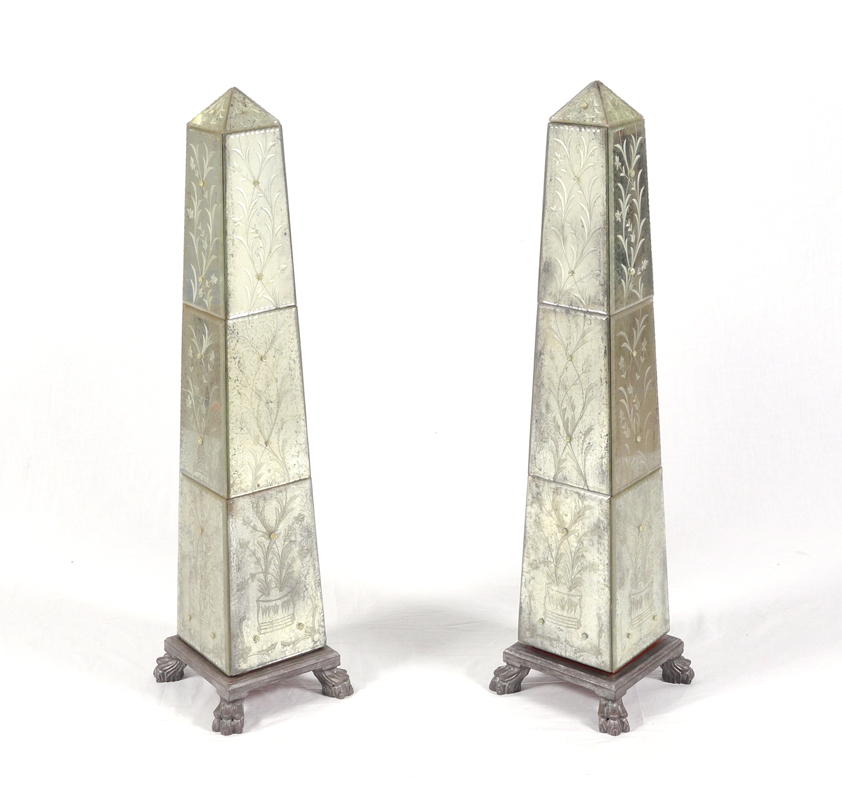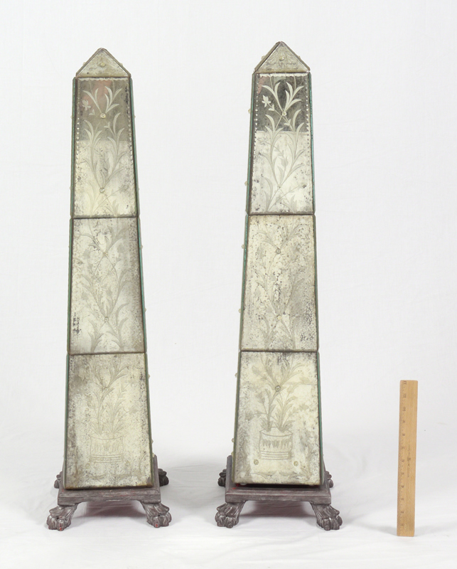 PAIR VENETIAN GLASS STYLE FLOOR OBELISK: Contemporary Venetian style reminiscent of a Grand Tour find, antiqued to give the appearance of age. On carved wood bases with paw feet, 36 1/2'' h. x 9 1/2''.